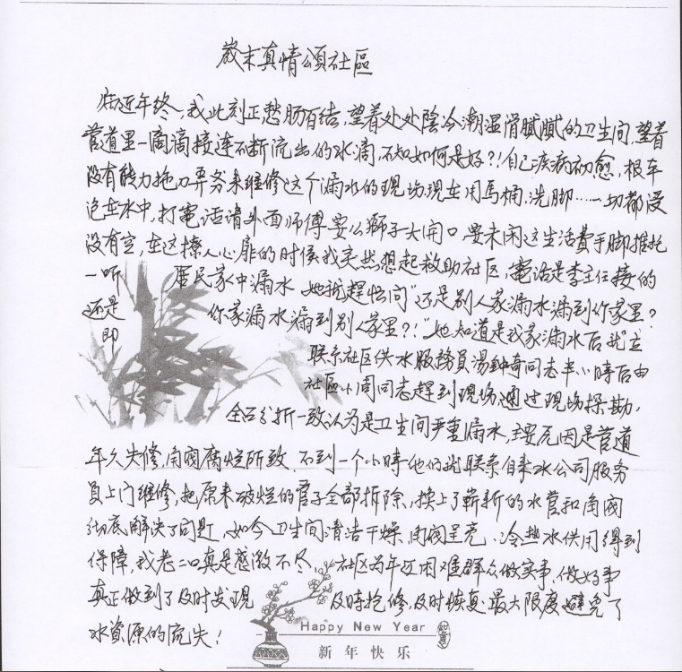 來信人家中漏水,年老無力,不得已求助社區,知道他的情況后,供水管網所駐社區人員半小時內趕到老人家中,檢查漏水原因,聯系管網所上門維修,最終徹底解決了問題。老人在信中充滿感激地說道:“一直以來蘇安南社區積極參與對困難群眾的幫扶,節日慰問走訪,對小區環境的衛生整治都有口皆碑,社區的建設是當前國家崛起的重要標志,社區是我們幸福的家園。”
