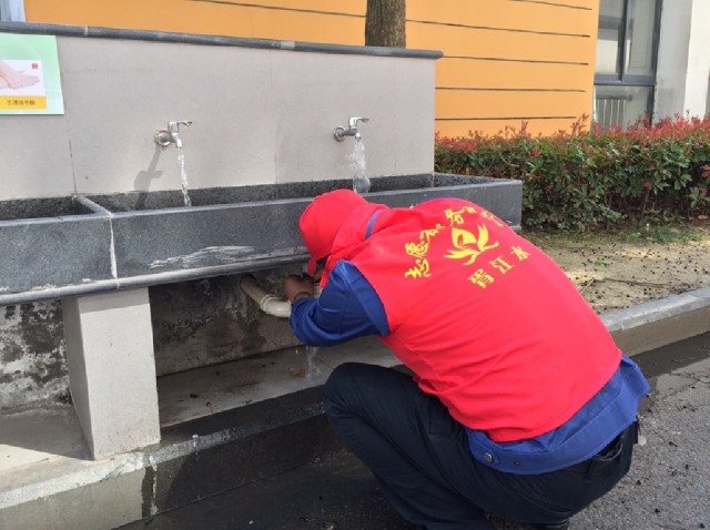 在胥口實驗小學,身穿紅馬甲的黨員志愿服務隊員,打開了校園內的消防栓,通過放水對校園內的自來水管網進行沖洗。同時,他們還對水龍頭進行檢查,修復破損的落水管。