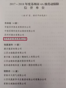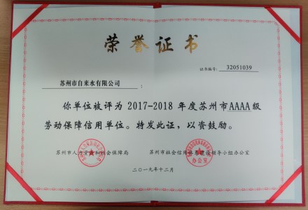 市自來水公司于近日收到了由蘇州市勞動保障部門、蘇州市社會征信部門聯合頒發的“2017-2018年度蘇州市AAAA級勞動保障信譽單位”榮譽證書,這是公司繼獲得“蘇州市AAA級勞動保障信譽單位”后的又一榮譽稱號。
