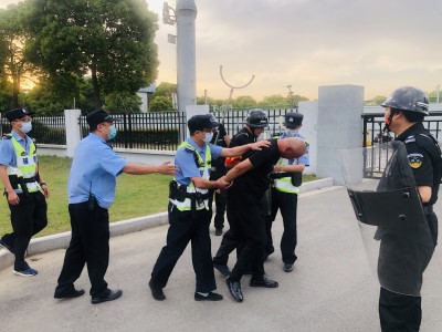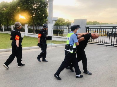 演練開始,一名“醉漢”在水廠南門耍酒瘋毆打過路職工,并且揮舞著尖刀,欲強闖水廠,情況十分危急。保安隊長見狀迅速帶領兩名全副武裝的保安人員趕至現場,同時撥打相城區中心商貿城派出所電話報警,三名保安人員相互配合使用警棍、鋼叉及盾牌將這名不明身份的男子逼入空曠地帶,一面疏散周圍群眾進行警戒,一面分散“醉漢”注意力后,將其擒獲,有效控制事態發展。隨后趕到的相城區中心商貿城派出所警察將“蓄意尋釁肇事者”帶至派出所處置。