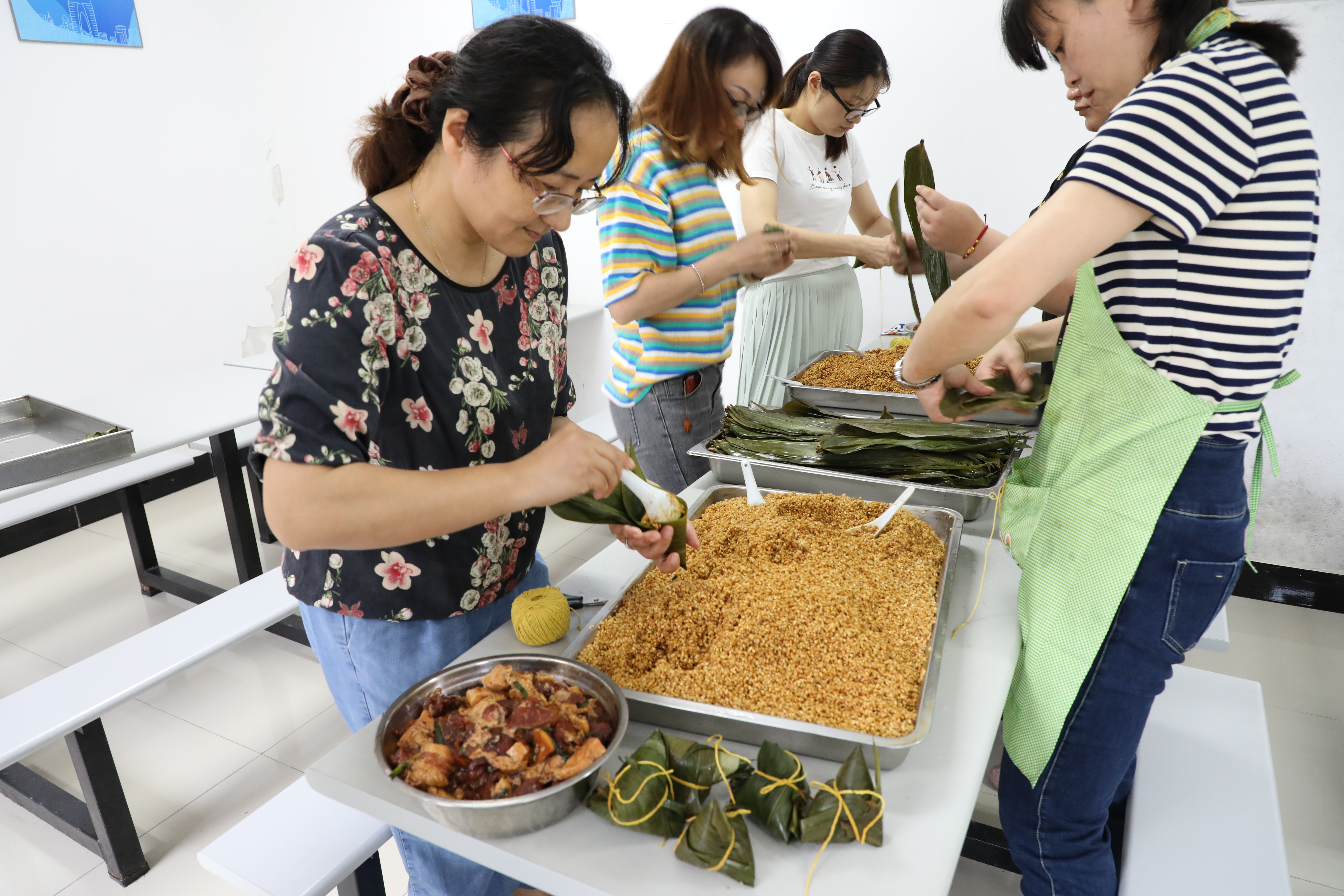 活動現場,大家相互交流切磋包粽子的技藝,“包粽子新手們”由開始的手藝生疏到逐漸進入佳境,從捋粽葉、填糯米到壓實扎捆,整個過程一氣呵成。