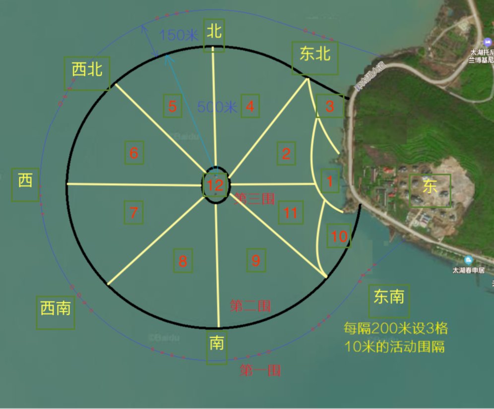 在水源地取水口從內而外設置三道攔截網,并在中心取水盆外圍設置水幕噴淋圍隔和曝氣設備,通過人造波浪阻止外圍藻類向吸水盆聚集,增加湖體水動力,抑制藍藻生長。