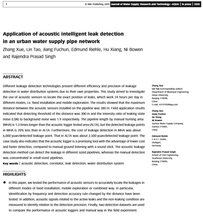 江蘇省城鎮供水安全保障中心、蘇州市自來水有限公司于2017年9月與德國燃氣與水工業協會水科技中心簽署了“中德合作供水網絡(SIGN)項目”。截至目前,該項目已在管網漏點探測領域取得了階段性研究成果,部分技術成果已成功應用于實際管控工作之中,取得了良好效果。