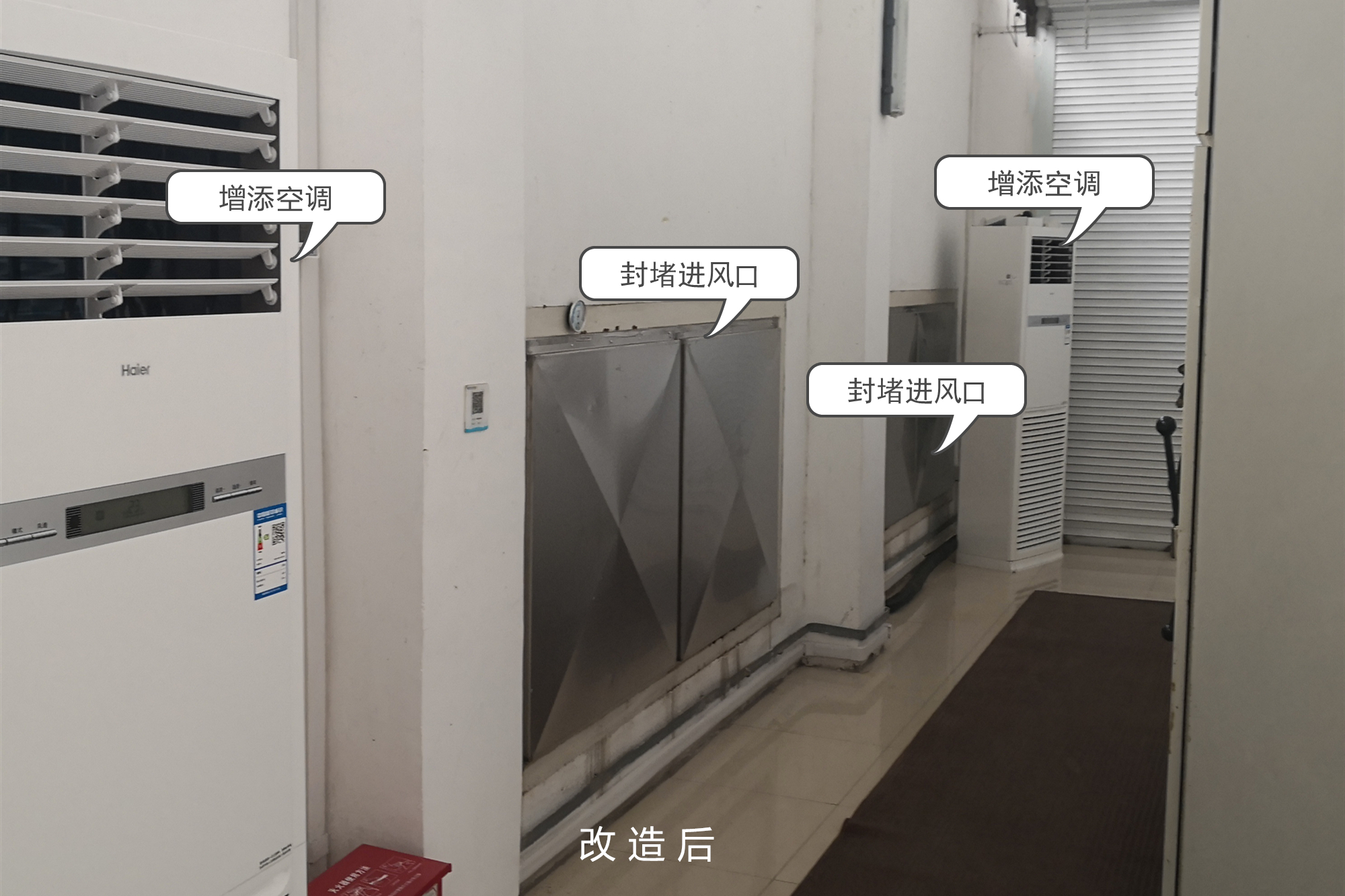 改造前,白洋灣水廠變頻器室均采用外循環通風散熱模式,無法對室外灰塵、潮氣等實現有效防護隔離,由此易造成設備超溫,加速電子元器件的老化引起變頻器跳閘等故障。為消除此處安全隱患,今年上半年,白洋灣水廠二泵房率先完成公司首次高壓變頻器室全封閉空調內循環冷卻改造。經過一段時間的運行觀察,變頻器濾網、變頻器柜內積塵現象明顯好轉,濾網更換周期延長,設備運行穩定,故障率明顯降低,改造效果顯著,極大提高了生產系統的安全性。基于上次成功改造的經驗,白洋灣水廠決定將此舉進一步推廣,并于近日完成了金墅泵站3#高壓變頻器室的全封閉空調內循環冷卻改造。本次改造共增添5匹基站型空調2臺,對原有進風口及排風道分別進行封堵和拆除,目前運行狀況良好。