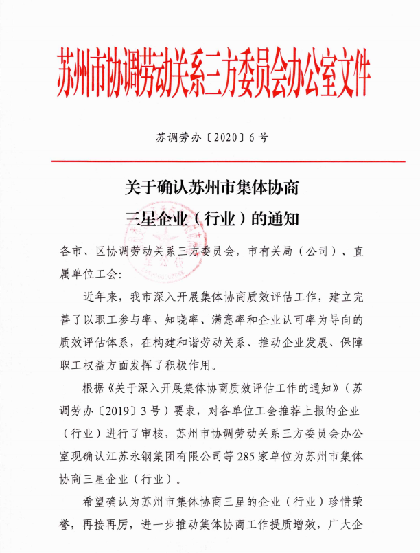 市自來(lái)水公司于近日收到了由蘇州市協(xié)調(diào)勞動(dòng)關(guān)系三方委員會(huì)辦公室公布的“蘇州市集體協(xié)商三星企業(yè)(行業(yè))”清單,公司位列其中。