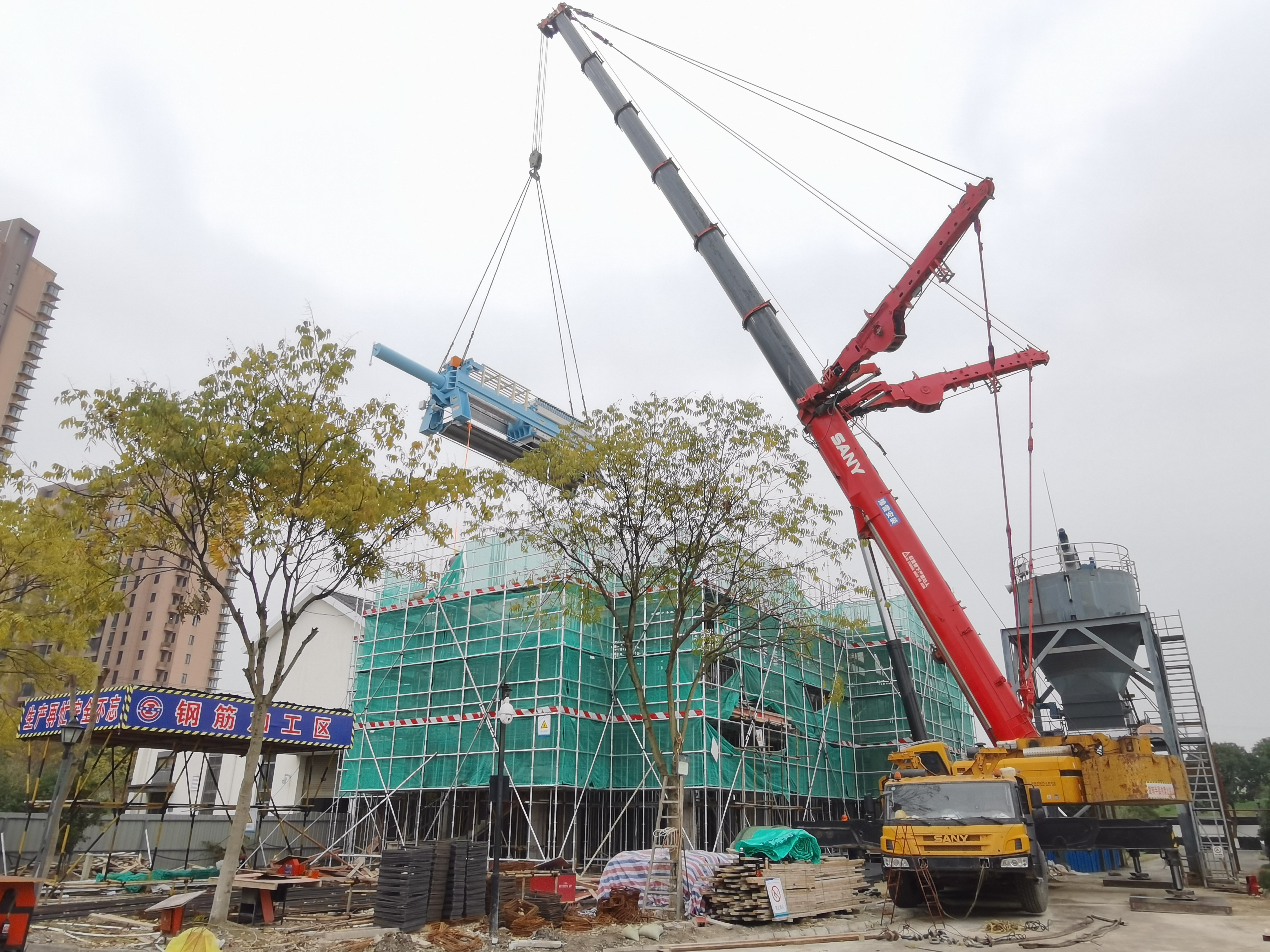 本次吊裝的兩臺(tái)板框機(jī)長(zhǎng)度為13米,總重量達(dá)80噸。由于現(xiàn)場(chǎng)車輛作業(yè)面小,吊裝距離遠(yuǎn),且需在建筑物封頂前完成吊裝,涉及到土建結(jié)構(gòu)的工作面交接及現(xiàn)場(chǎng)結(jié)構(gòu)、腳手架保護(hù),增加了工程難度。胥江水廠妥善協(xié)調(diào)相關(guān)單位,積極做好配合工作,合理安排各方施工進(jìn)度。反復(fù)討論、修訂吊裝方案,并最終獲得方案論證專家組認(rèn)可,決定由一輛300噸吊車加超起裝置實(shí)施吊裝工作。