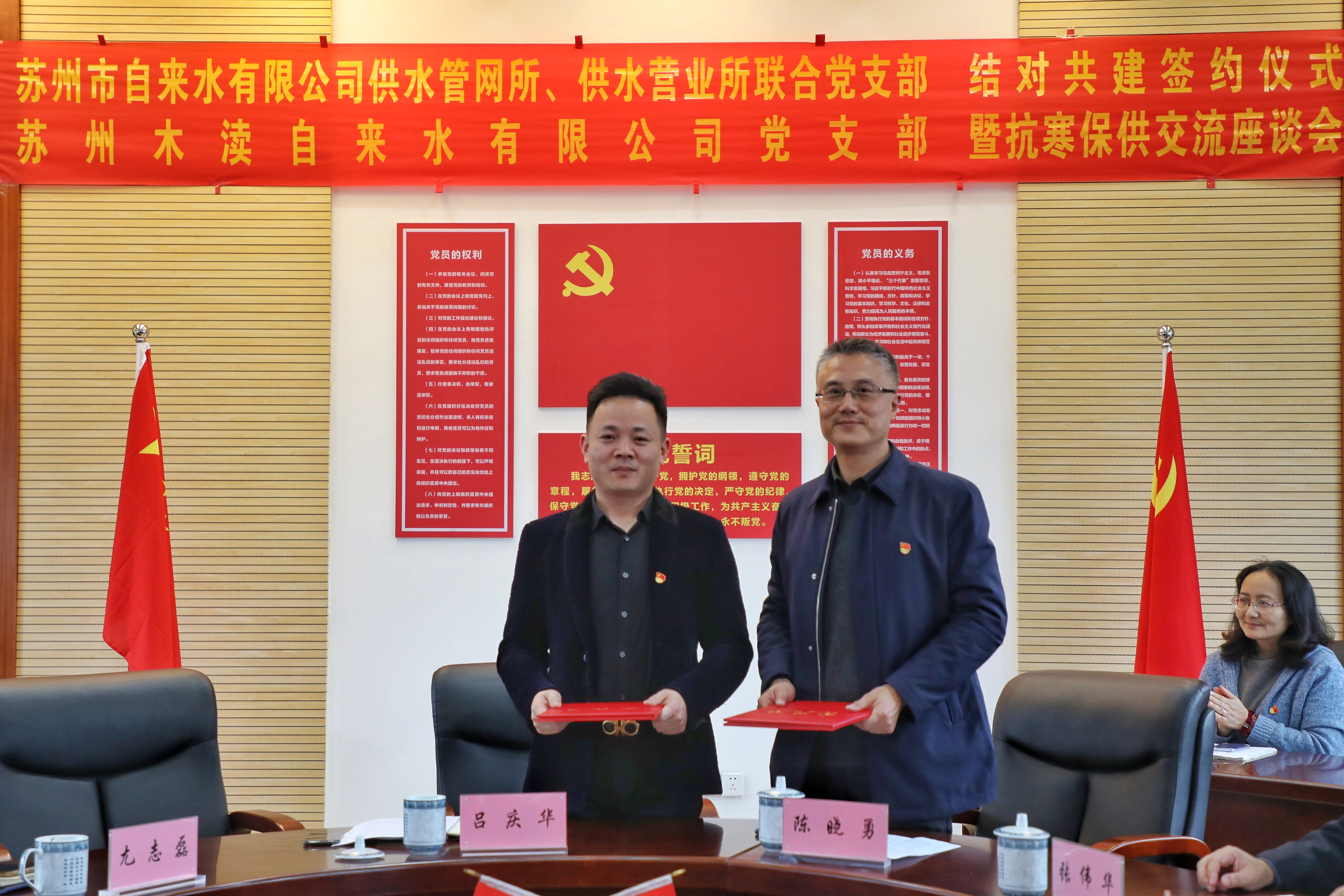 為進一步實現黨組織優勢互補,提高支部的創造力、凝聚力和戰斗力,近日,市自來水公司供水管網所、供水營業所聯合黨支部與蘇州木瀆自來水有限公司黨支部舉行結對共建簽約活動暨抗寒保供交流座談會,市自來水公司黨委委員、總工程師紀永超參加活動并作講話。