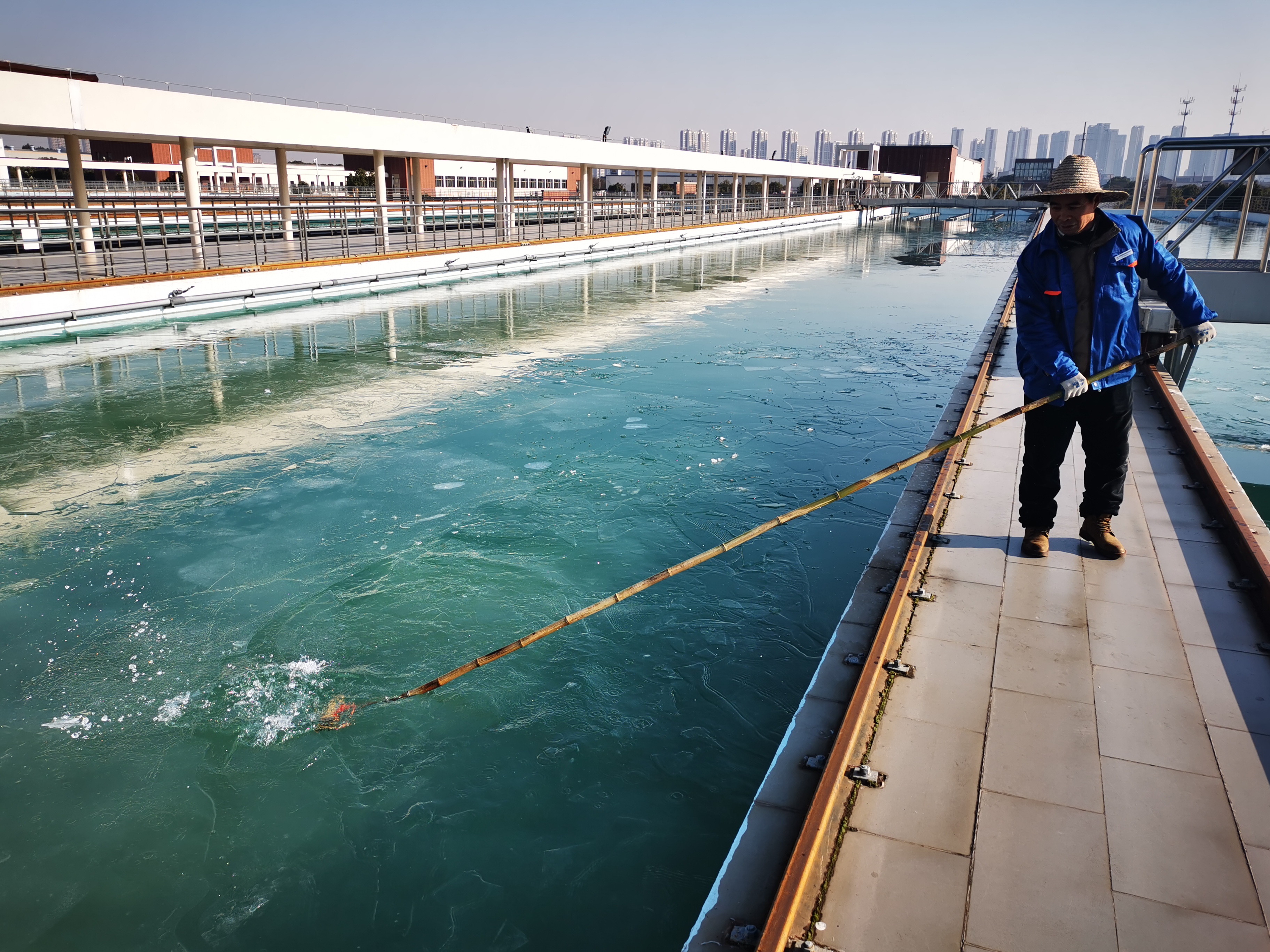二、確保水廠生產工藝穩定。低溫冰凍天氣對水廠凈水工藝影響主要集中在水流平緩的沉淀池上,水廠提前開啟防凍噴淋系統緩解池面結冰,并利用熱水轉輸裝置及時解決了排泥行車排泥管凍住的問題。白洋灣和相城水廠個別沉淀池排泥行車出現脫軌故障,水廠值班人員和在廠駐守的實業公司維修人員第一時間展開搶修,保障行車正常運行。各廠加強了人員值守,對行車脫軌、儀表取樣管冰凍、尾氣破壞裝置故障等問題及時修復,未對水廠工藝運行造成較大影響。