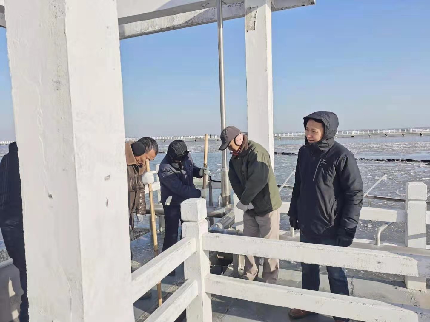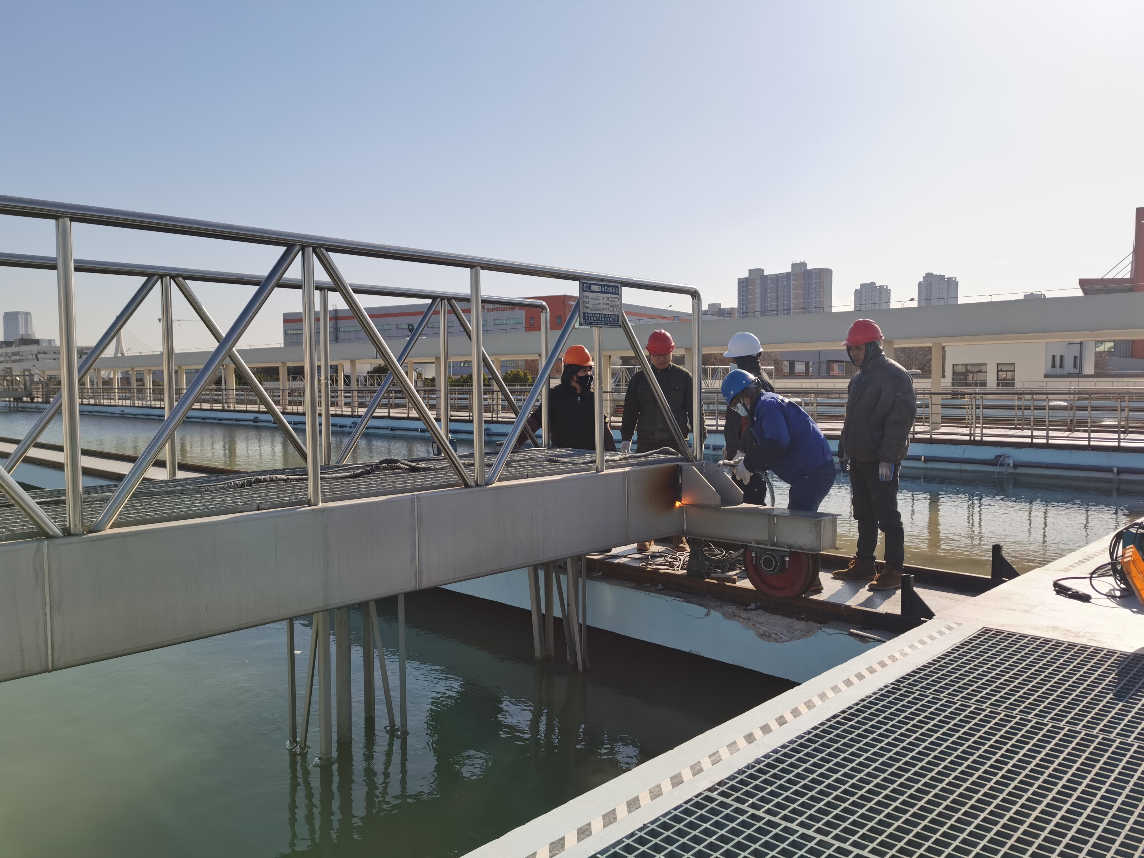 各水廠加強了應急人員的駐廠值守,針對易受冰凍天氣影響的設備設施加強巡檢力度,做好了查漏補缺、措施改進和舉一反三的工作,漁洋山取水泵房增設了熱水應急轉輸系統,水廠完成砂濾池進、排水閥門保溫套雙層保暖安裝和沉淀池噴淋管的改裝,次氯酸鈉儲備間增加的取暖設施防止藥劑凍結等一系列措施,有效增強了供水生產的保溫防凍能力。值班人員還加強對廠內氣動系統、排泥行車排泥管電加熱帶和排泥行車等設施的巡檢工作,對沉淀池因噴淋死角導致的結冰及時破冰撈除,做到有效預防、及時發現和有效處置。本次寒潮新上崗的熱水轉輸系統有效的解決了排泥行車排泥管,污泥料倉卸料閥的結凍問題,保障了沉淀池排泥和污泥系統正常運行。針對第一波寒潮橋管上壓力監測點取樣管容易冰凍的問題,技術人員試點并推廣在取樣管上新增旁路管道,極端冰凍天氣下打開旁路管道滴水成線,第二波寒潮期間改造后的二級監測點未發生冰凍故障。