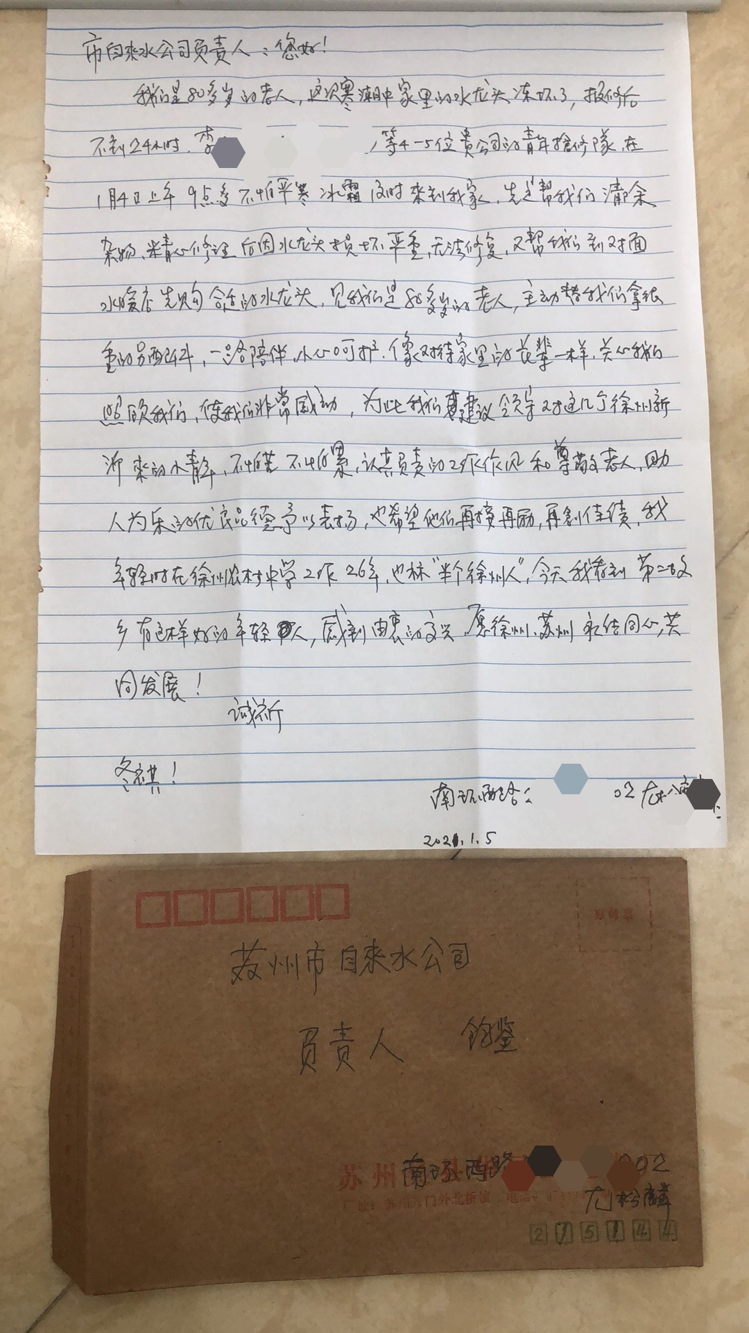 近日,家住蘇州南環西路27號2幢的尤老先生來到供水營業大廳,為市自來水公司維修人員送來一封溫暖的表揚信,字里行間表達了深深的感激之情。