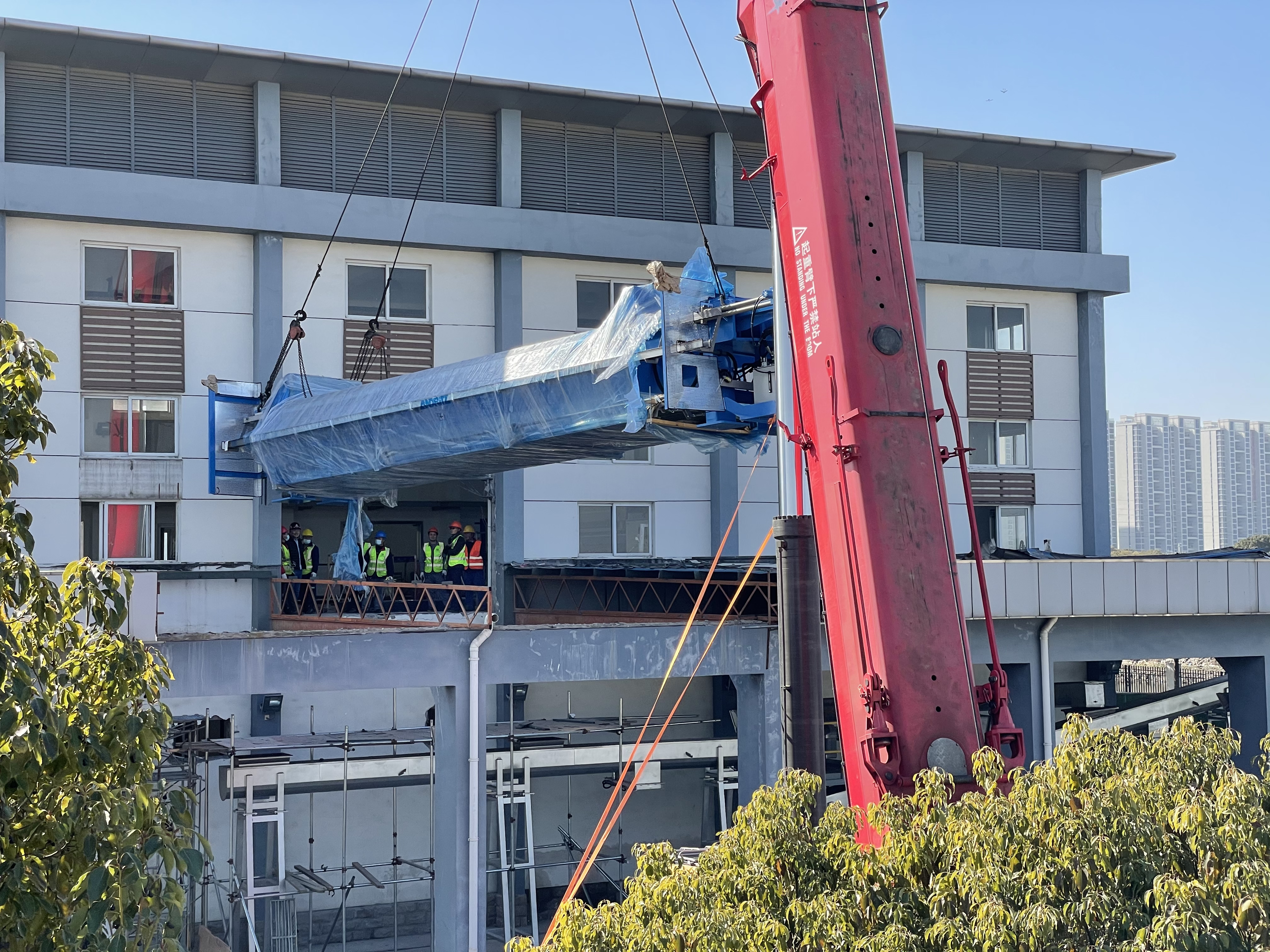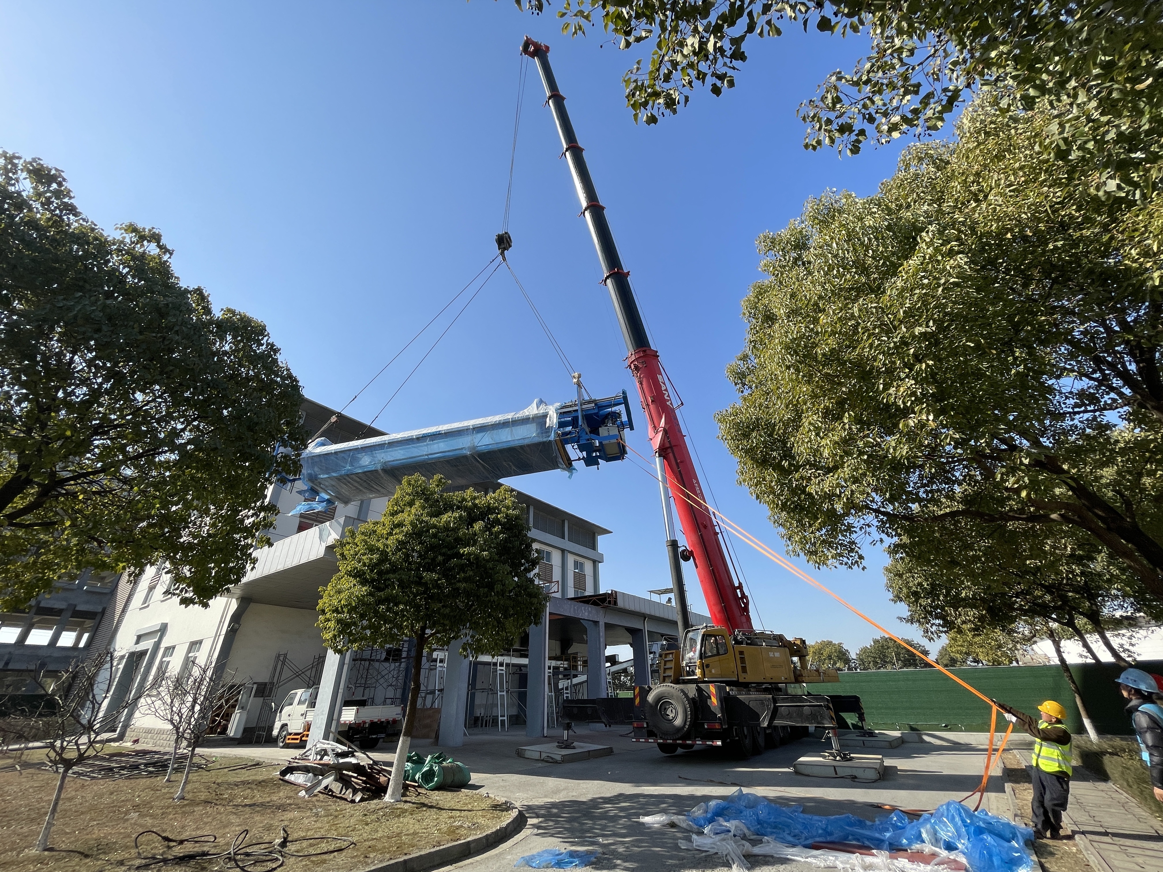 當(dāng)日,在施工前期準(zhǔn)備充分后,現(xiàn)場施工人員嚴(yán)格按照方案內(nèi)容,安全有序地完成了吊裝工作。此次新增板框脫水機(jī)順利吊裝完成,保障了下一步相城水廠二期生產(chǎn)設(shè)備順利投入運(yùn)行。