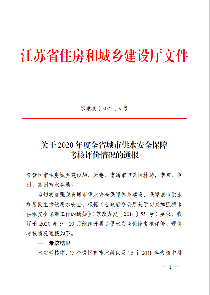 省住建廳根據《省政府辦公廳關于切實加強城市供水安全保障工作的通知》(蘇政辦發[2014]55號)的要求,于2020年9月至10月組織開展了供水安全保障工作考評。