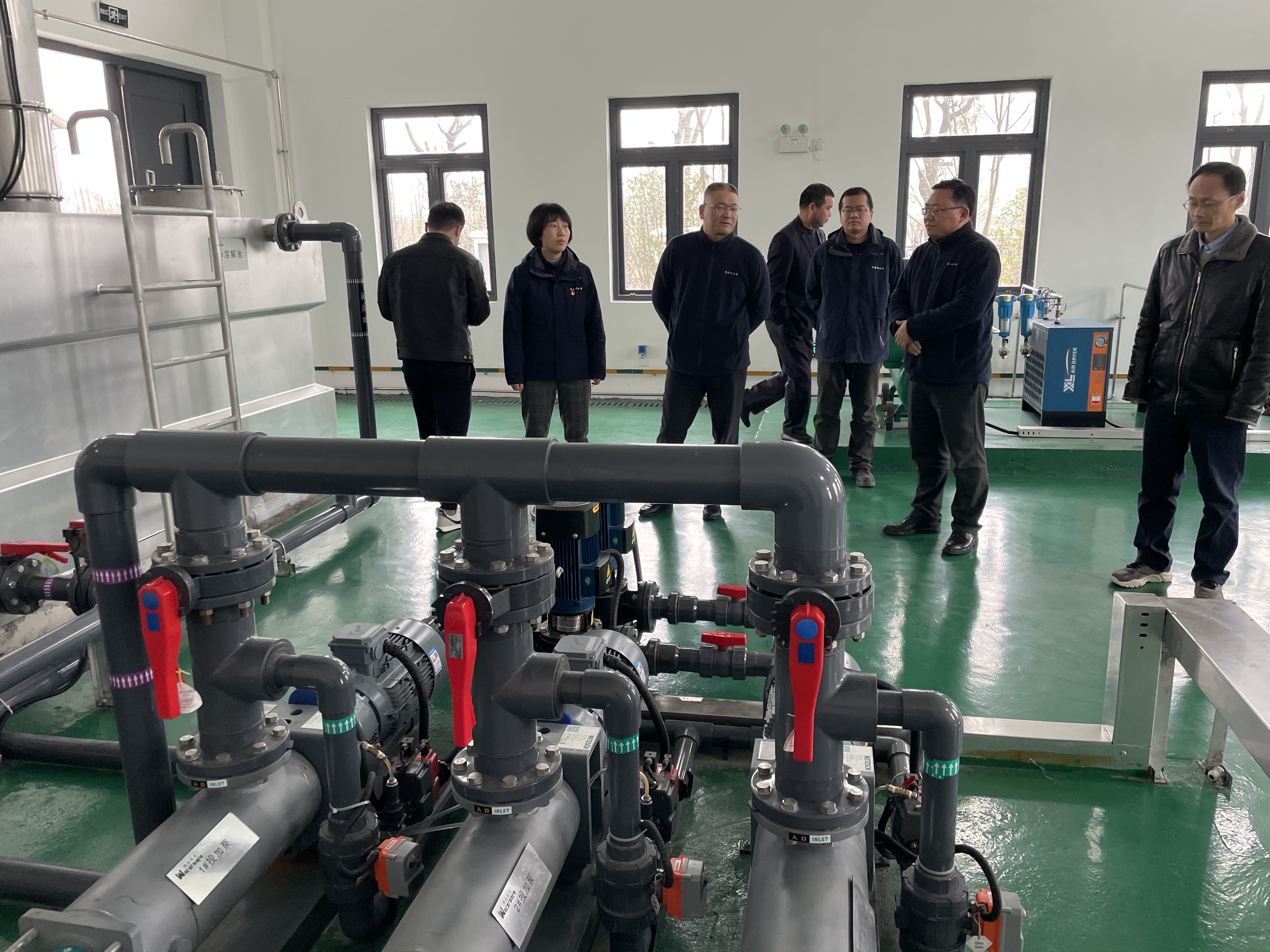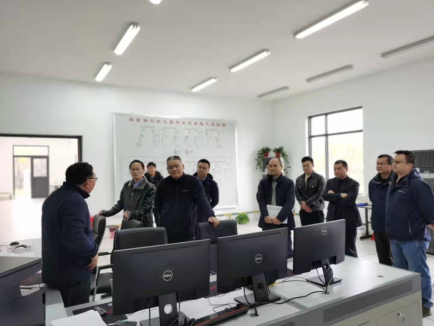 孫董一行先后檢查了泵站取水口、中控室、泵房、加藥間等場所并查看了設備設施運行狀態,重點聽取了關于泵站全覆蓋監控、上位機一體化開停切泵、遠程門禁控制、設備參數監控報警、車輛自動稱重管理等自控系統建設的情況匯報。