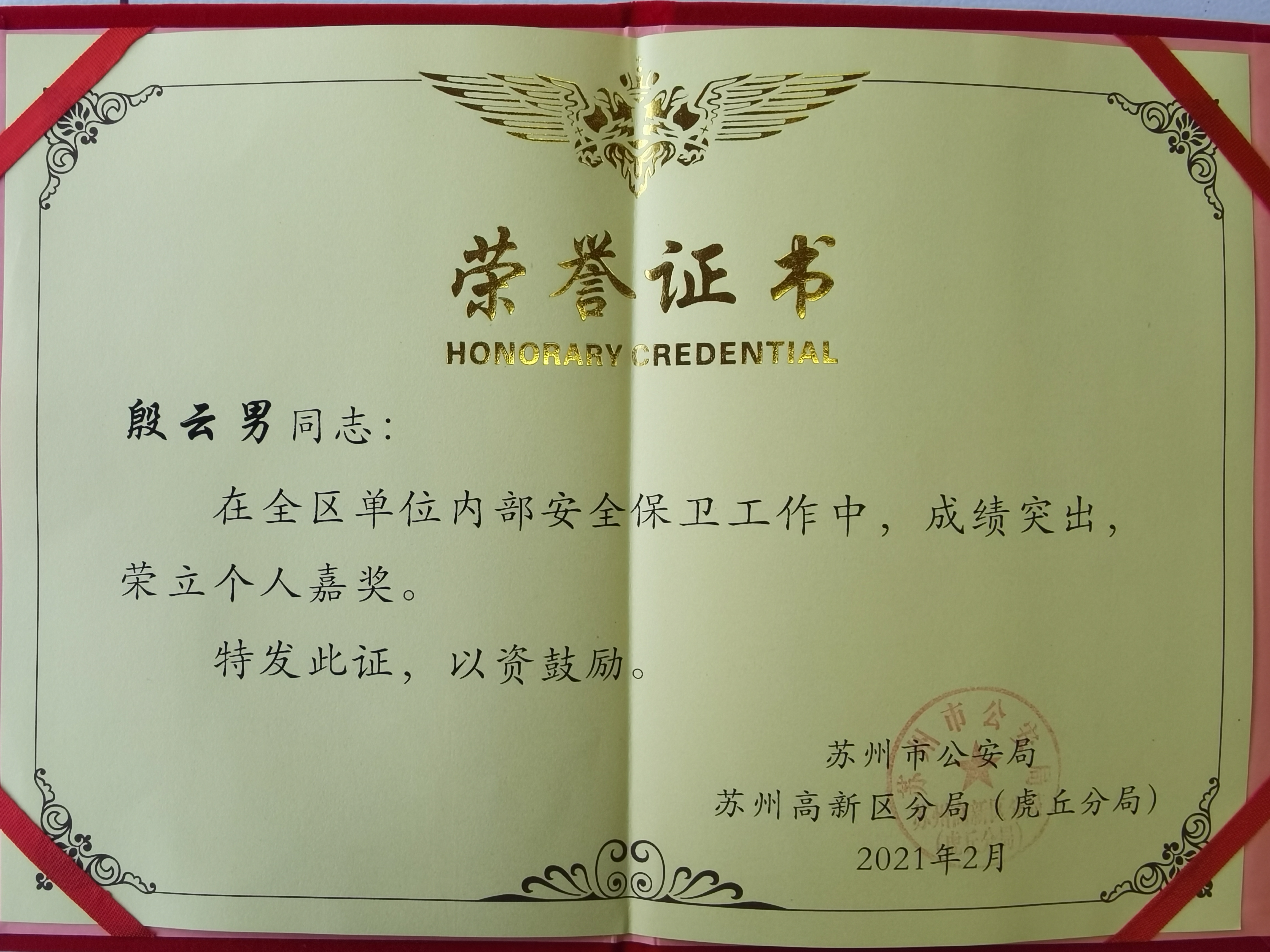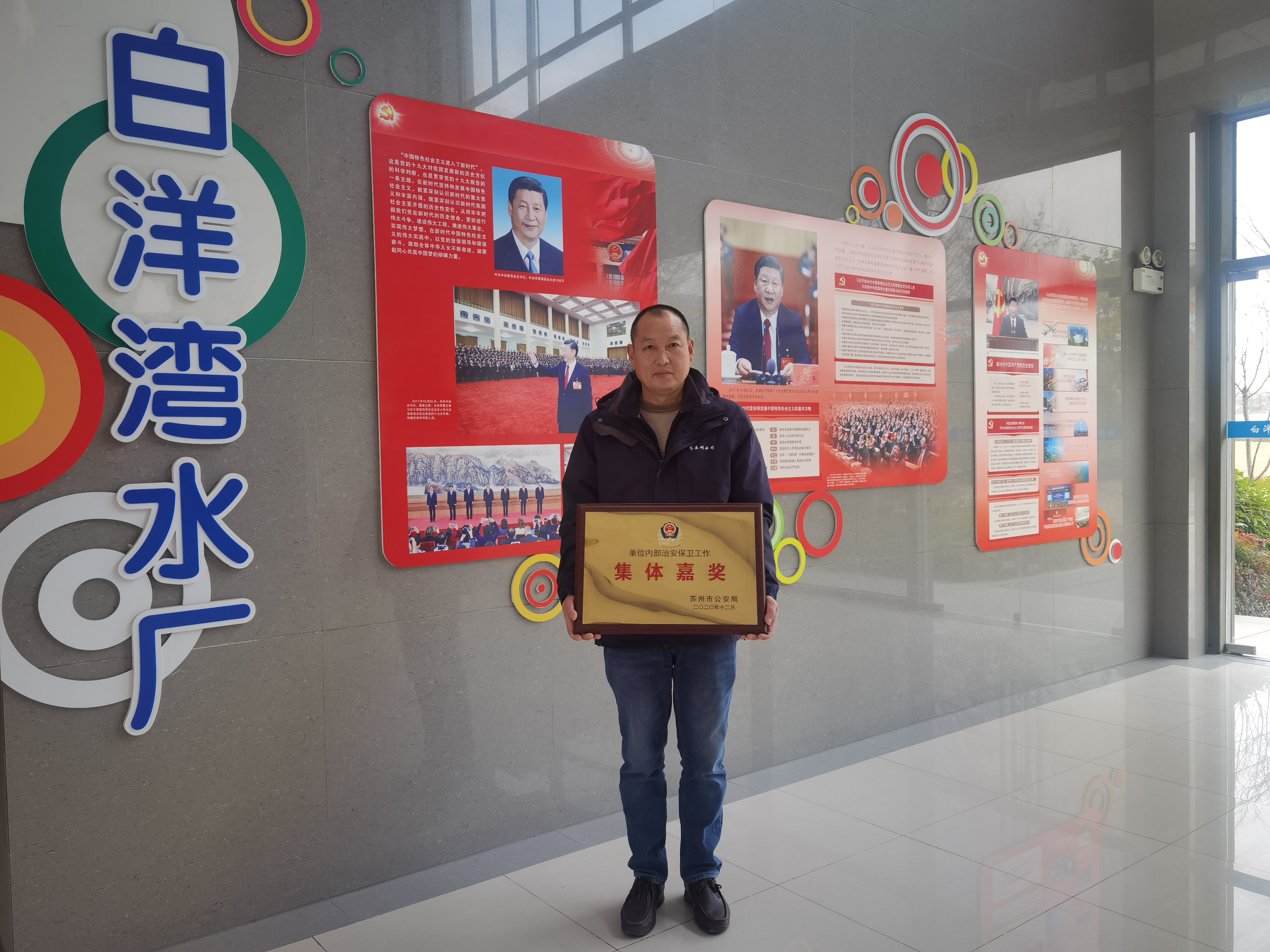 近日,白洋灣水廠(chǎng)職工殷云男同志因在高新區(qū)單位內(nèi)部安全保衛(wèi)工作中成績(jī),獲得了由蘇州市高新區(qū)公安局(虎丘分局)頒發(fā)的“個(gè)人嘉獎(jiǎng)”先進(jìn)表彰。