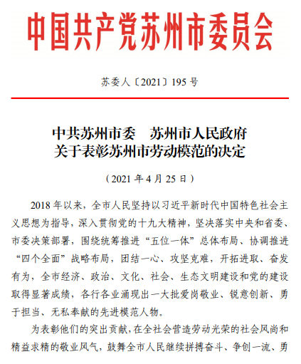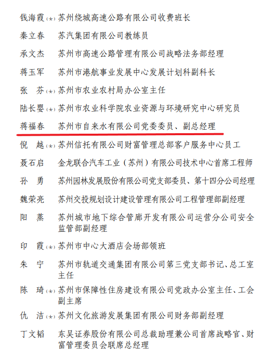 在五一勞動節來臨之際,中共蘇州市委、市府發布了《關于表彰蘇州市勞動模范的決定》,市自來水公司黨委委員、副總經理蔣福春同志榮獲“蘇州市勞動模范”榮譽稱號。