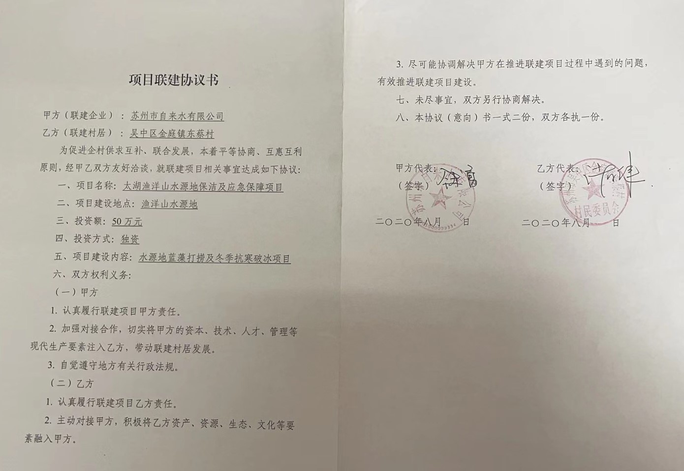 為積極響應市委市政府“萬企聯萬村、共走振興路”行動號召,2020年8月,市自來水公司與吳中區金庭鎮東蔡村簽訂聯建合作協議,切實發揮雙方技術設備和人力資源配備優勢,推動鄉村振興發展、牢筑水源地安全防線。