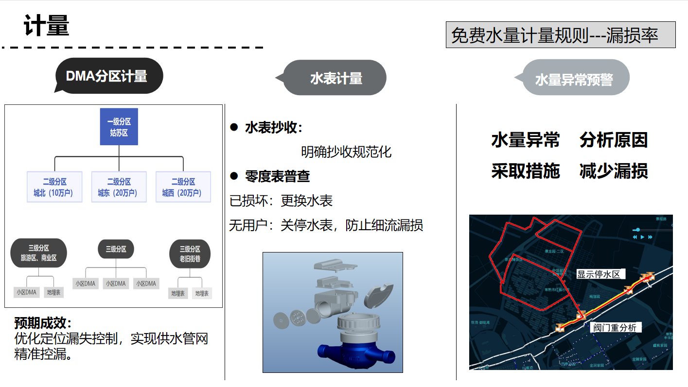 姑蘇區(qū)老舊小區(qū)眾多,產(chǎn)銷差管控難度較大,為此,市自來(lái)水公司成立產(chǎn)銷差管控工作組,借助信息化手段,構(gòu)建技術(shù)型控漏體系,統(tǒng)籌推進(jìn)公司產(chǎn)銷差管控工作。工作組下設(shè)領(lǐng)導(dǎo)小組、管控辦公室、方案研究組和方案實(shí)施組。在領(lǐng)導(dǎo)小組的帶領(lǐng)下,方案研究組主要負(fù)責(zé)方案制定、數(shù)據(jù)分析和實(shí)施效果評(píng)估等工作;方案實(shí)施組主要負(fù)責(zé)具體方案落實(shí)、相關(guān)數(shù)據(jù)統(tǒng)計(jì)和方案執(zhí)行效果反饋等工作。工作組將考慮高品質(zhì)供水、供水設(shè)施薄弱區(qū)改造、產(chǎn)銷差管控三大戰(zhàn)略目標(biāo),實(shí)現(xiàn)控漏措施的系統(tǒng)化、科學(xué)化、精細(xì)化總目標(biāo)。