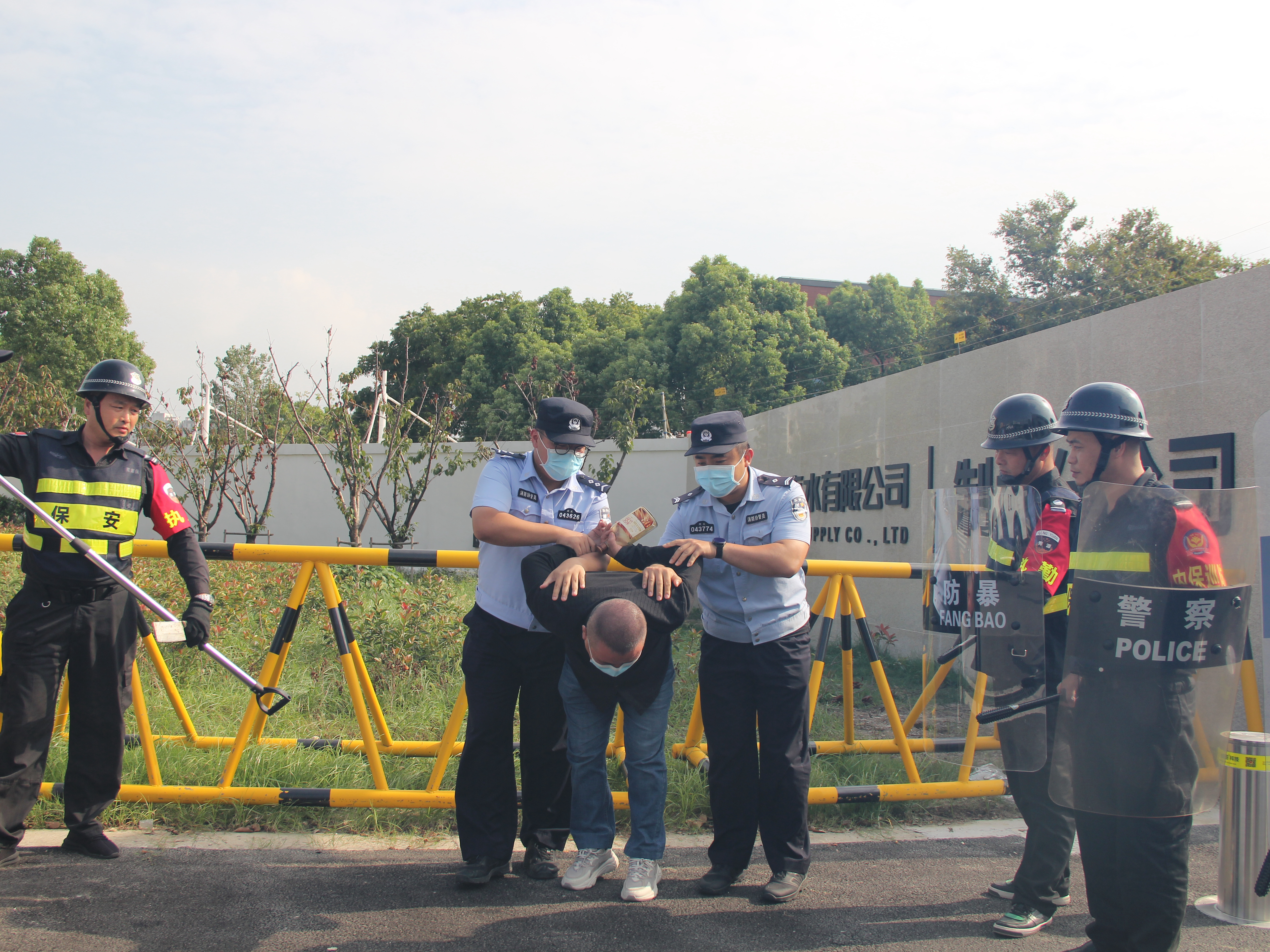 演練前,制水分公司對(duì)所有參演安保人員進(jìn)行了崗位業(yè)務(wù)技能培訓(xùn)和防暴器材的操作使用訓(xùn)練,并現(xiàn)場(chǎng)組織了一次保安業(yè)務(wù)知識(shí)測(cè)試。隨后,演練正式開始,一名“醉漢”在白洋灣水廠南門“毆打”過(guò)路職工,揮舞著“尖刀”,欲強(qiáng)闖水廠,情況十分危急。保安隊(duì)長(zhǎng)迅速帶領(lǐng)三名全副武裝的保安人員趕至現(xiàn)場(chǎng),同時(shí)撥打滸關(guān)經(jīng)濟(jì)技術(shù)開發(fā)區(qū)派出所電話報(bào)警。四名保安人員相互配合使用警棍、鋼叉及盾牌將這名不明身份的男子逼入空曠地帶,疏散周圍群眾進(jìn)行警戒,并在分散“醉漢”注意力后將其擒獲,有效控制事態(tài)發(fā)展。隨后趕到的滸關(guān)經(jīng)開區(qū)派出所警察將“蓄意尋釁肇事者”帶至派出所處置。