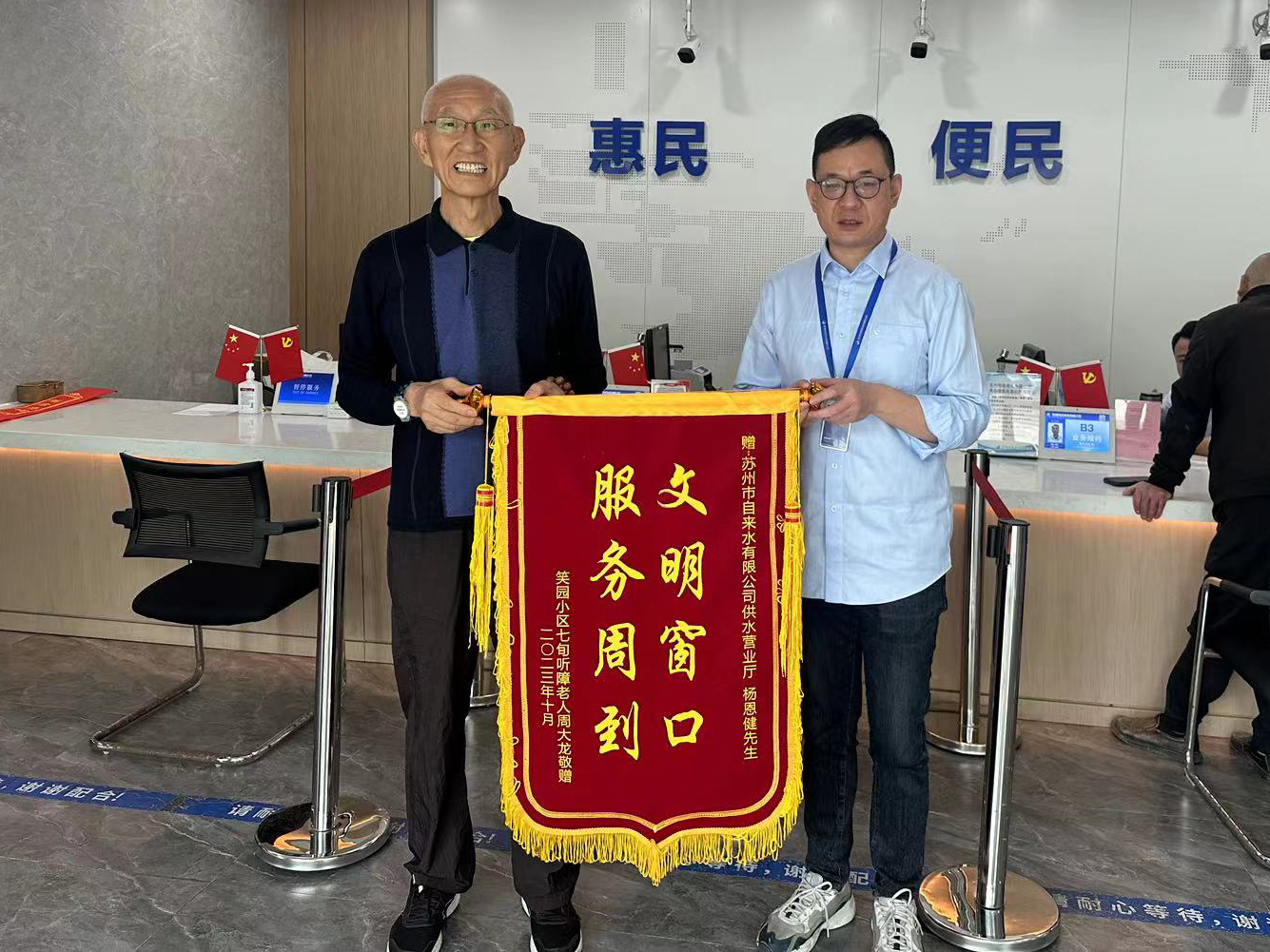 近日,一位老人帶著錦旗來到供水營(yíng)業(yè)廳,要將其送給營(yíng)業(yè)廳的服務(wù)管理員楊恩健。