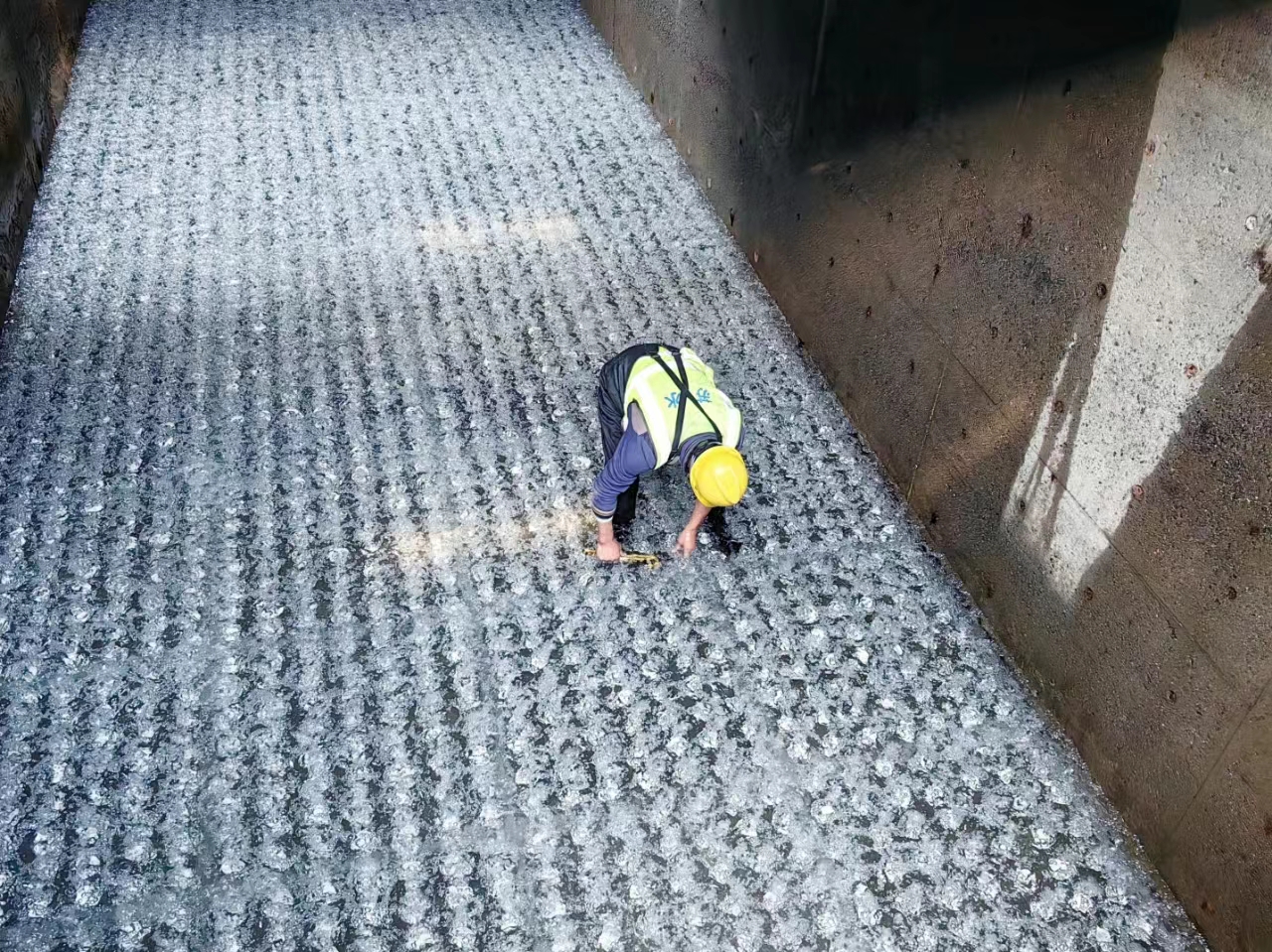 該項目于10月中旬進(jìn)場施工,按照舊炭與砂墊層的抽取、濾池大修、新炭裝填及濾池沖洗等步驟逐項開展,完成了濾頭更新、密封膠更換、濾池底部清理等內(nèi)容,并進(jìn)行氣密性試驗及曝氣試驗,保證濾池沖洗效果良好。大修期間,為避免揚(yáng)塵對廠區(qū)環(huán)境及作業(yè)人員健康造成影響,舊炭取出和新炭裝填均采用濕式裝填,新炭到廠后首先按規(guī)定進(jìn)行采樣送檢,檢測結(jié)果符合技術(shù)要求后再進(jìn)行裝填,并在裝填結(jié)束后根據(jù)方案沖洗開展水樣檢測,水質(zhì)達(dá)標(biāo)后再恢復(fù)投運(yùn),嚴(yán)格確保濾池出水水質(zhì)合格安全。