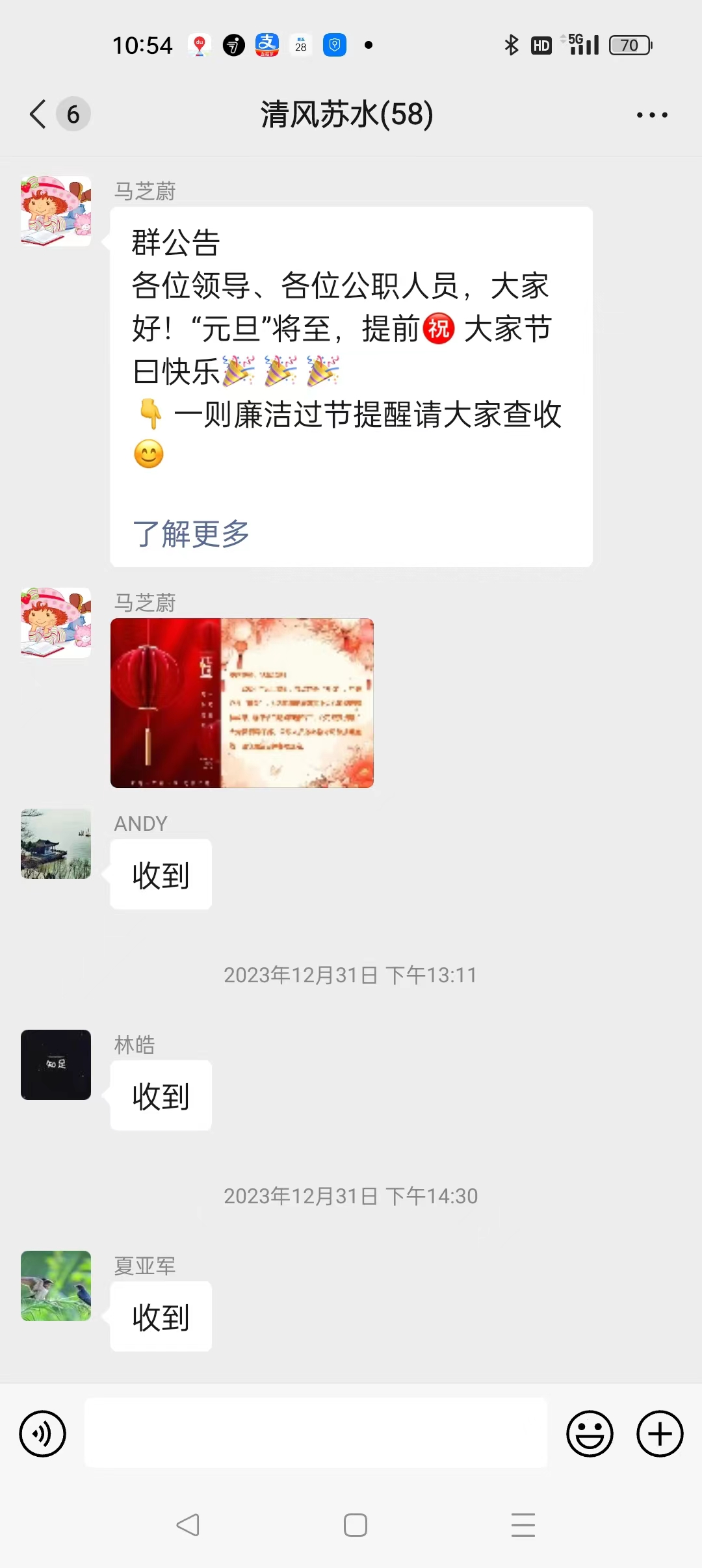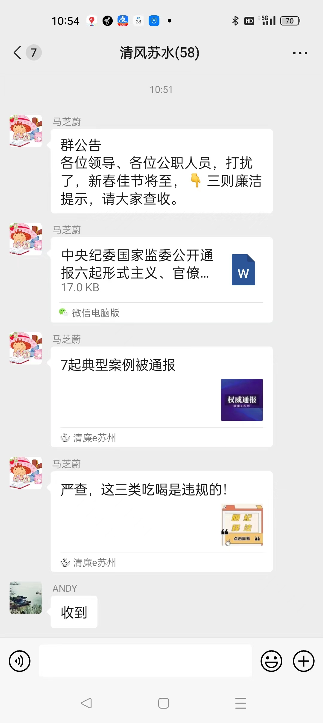 發送廉潔短信,營造清廉氛圍。在雙節來臨之際,公司紀委通過“清風蘇水”微信群發送廉政短信,及時給全體干部職工吹清風、敲警鐘、鳴警笛,將“指尖上的廉潔提醒”變為常態化,進一步增強了廉政教育的滲透力。