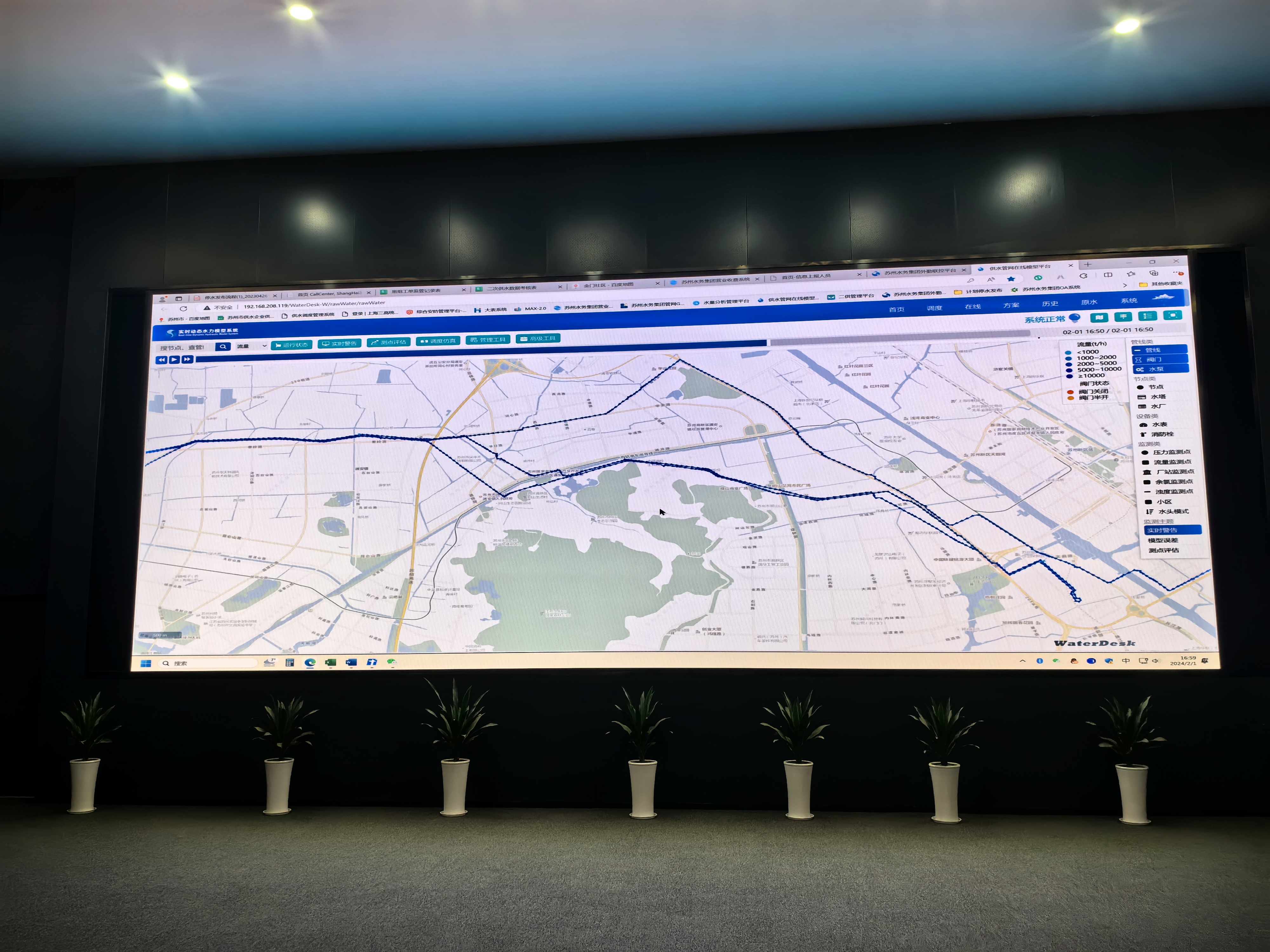 為保障原水系統的安全高效運行,公司以蘇州市白洋灣水廠原水系統作為研究與應用示范對象,以原水管網模型為基礎,開展了原水管道漏損定位、健康修復以及原水泵站的優化調度等相關研究,借助智能算法對原水水質進行預警分析,為制水生產保障提供技術指導,從而提升原水系統供水的應急保障水平。