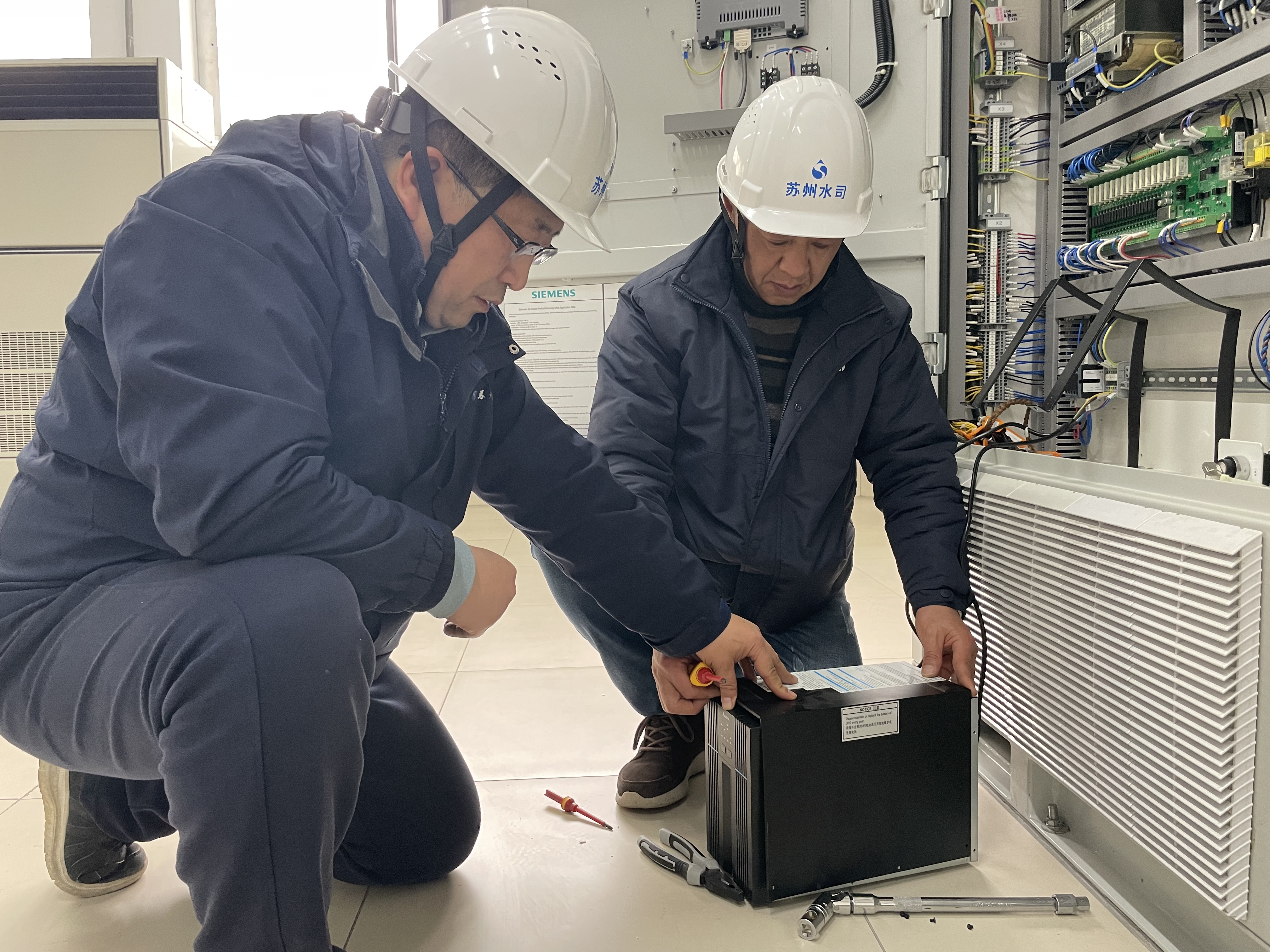 相城水廠工作人員在節前檢查中發現,陽澄湖取水泵站高壓變頻器UPS狀態不穩定、參數指標欠佳,檢測后判定為電池老化造成。當即采取臨時措施,恢復變頻器運行,隨后技術人員自主完成蓄電池更換、檢測、設備調試工作,消除了潛在風險,節約了維修成本,提高了泵站的運行安全。