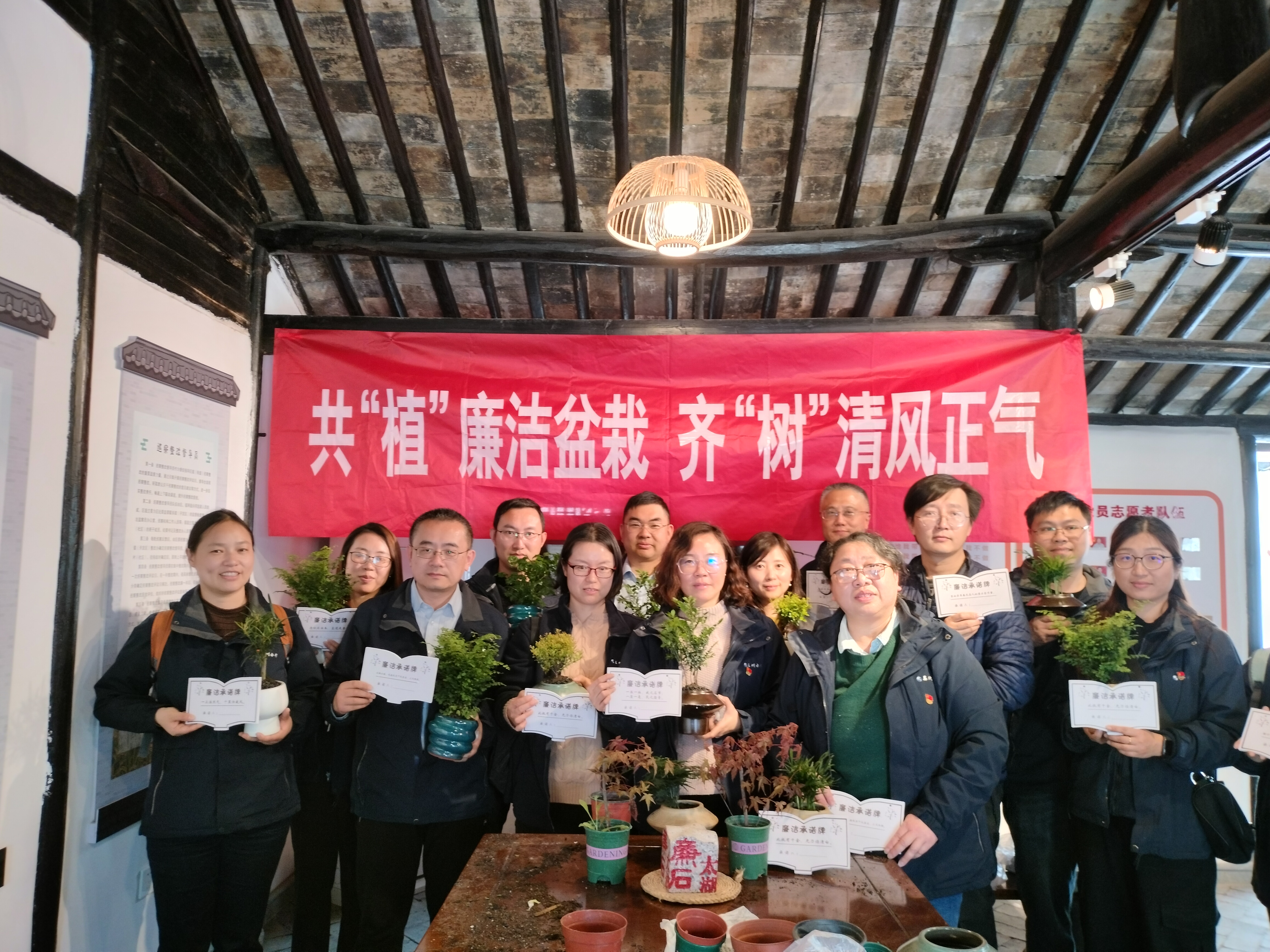 共“植”廉潔盆栽,齊“樹”清風正氣。下午,在江村文化園——“清風苑”內,大家動手種植觀音蓮、文竹等植物,以竹名志、以“蓮”喻“廉”,并將一張張廉政警語卡片插入盆中做點綴,在體驗盆栽種植樂趣的同時將“廉潔”的種子播種在心中。