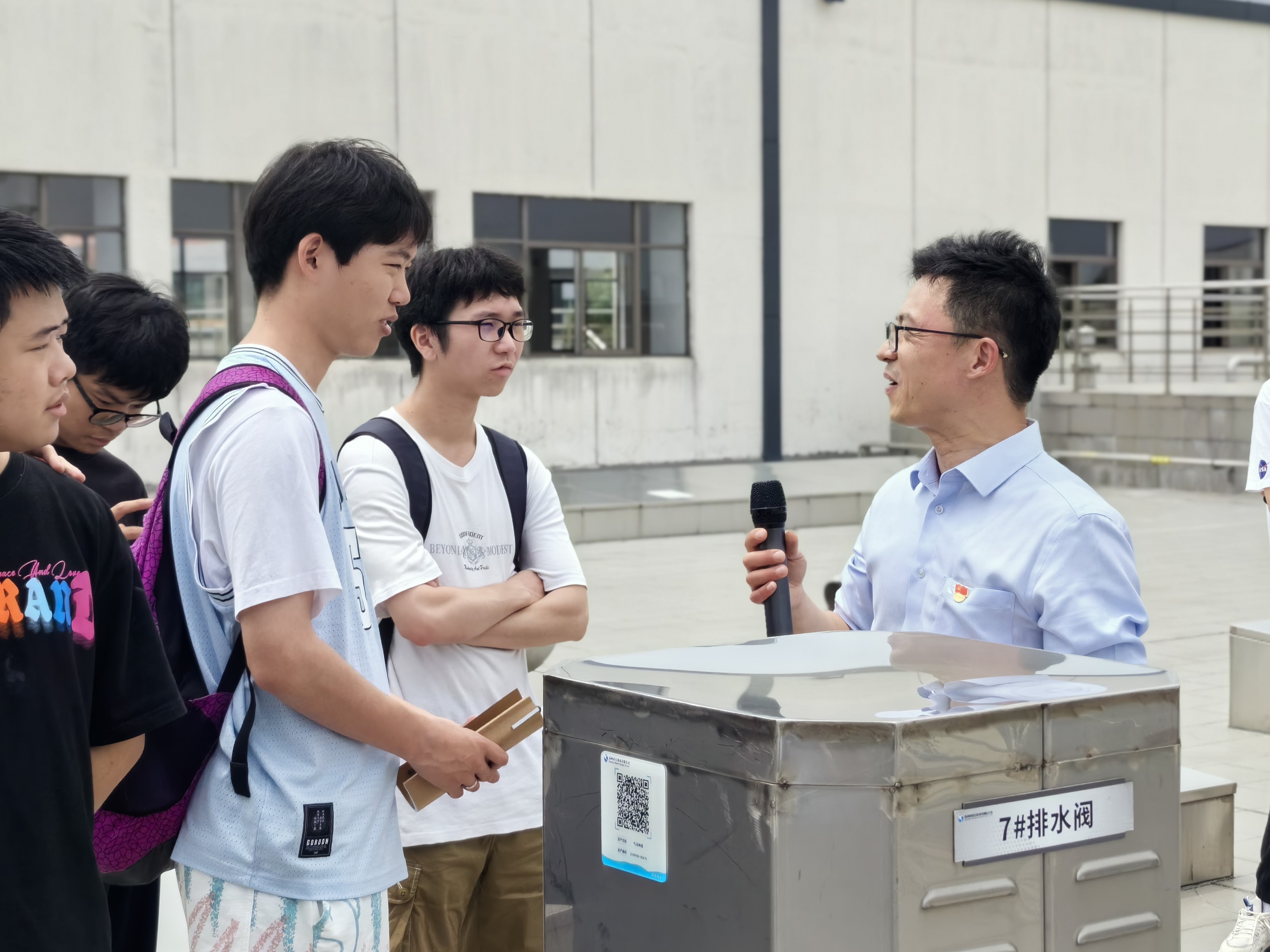 在講解員的介紹下,同學們對水廠供水規模、工藝流程、水質管控標準等情況有了基本認識,并依次實地參觀了沉淀池、砂濾池、炭濾池等凈水構筑物,認真學習了水廠的處理工藝、運行流程和管理機制。期間,同學們就虹吸排泥行車等設備設施的工作原理、凈水單體的工藝參數等與講解員深入交流,現場氣氛熱烈。