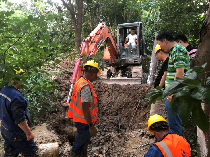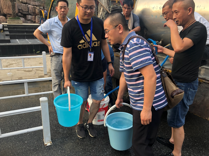 經工作人員現場查勘,確認漏點位于小區景觀帶內,由于回填土質松軟,操作空間小,給受損管道搶修增添了不少難度,但搶修人員冒著高溫,努力奮戰。一邊是緊急施工現場,一邊是志愿服務者在奔忙——考慮到此次突發停水適逢高峰用水時段,為減少對業主們日常生活的影響,公司立即行動,派出供水車奔赴現場及時送水;兩所黨員志愿者們也在第一時間趕往小區為居民發放桶裝礦泉水,并積極跟進管道維修進度,向業主們做好安撫解釋工作,并對只有老人和小孩在家的住戶優先送水上門,得到了用戶的肯定和理解,彰顯了黨員的先鋒模范作用。
