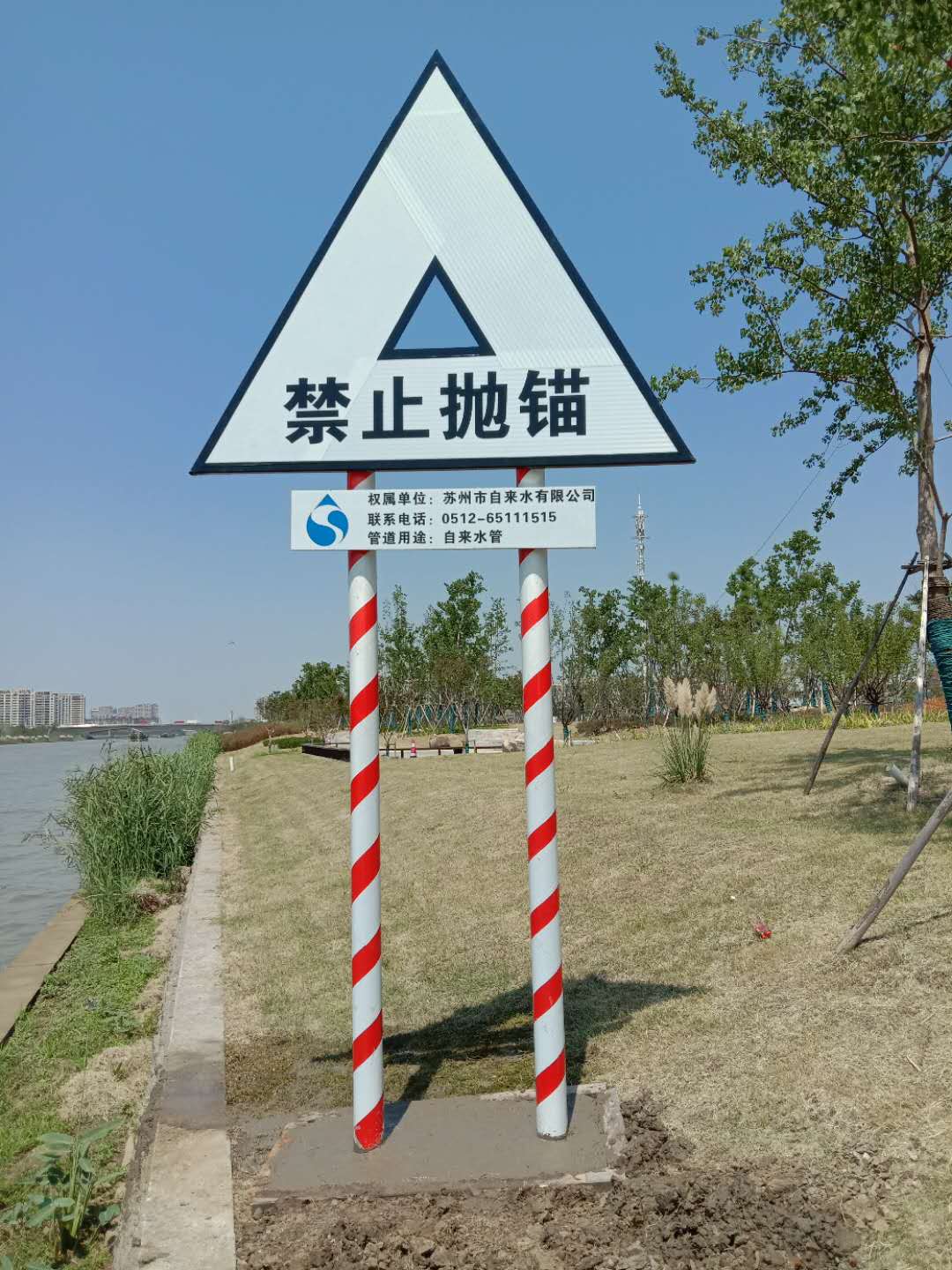 根據(jù)江蘇省蘇州市區(qū)航道管理站的要求,供水管網(wǎng)所全面梳理了相關涉航管道,并在管位正上方及航道的左、右岸各設一塊管線標。此次增設的管線標,標桿顯著位置清晰地標注了公司標志、聯(lián)系方式及管線簡要信息。標識采用鋼管立柱、等邊三角形標志牌、表面貼反光膜等工藝進行有效警示。反光膜在夜間燈光照射下,能反射出明亮清晰的光線,使船舶駕駛員或其他人員能看清禁止標志,在保障管線與航道安全方面起到了良好的提示作用。