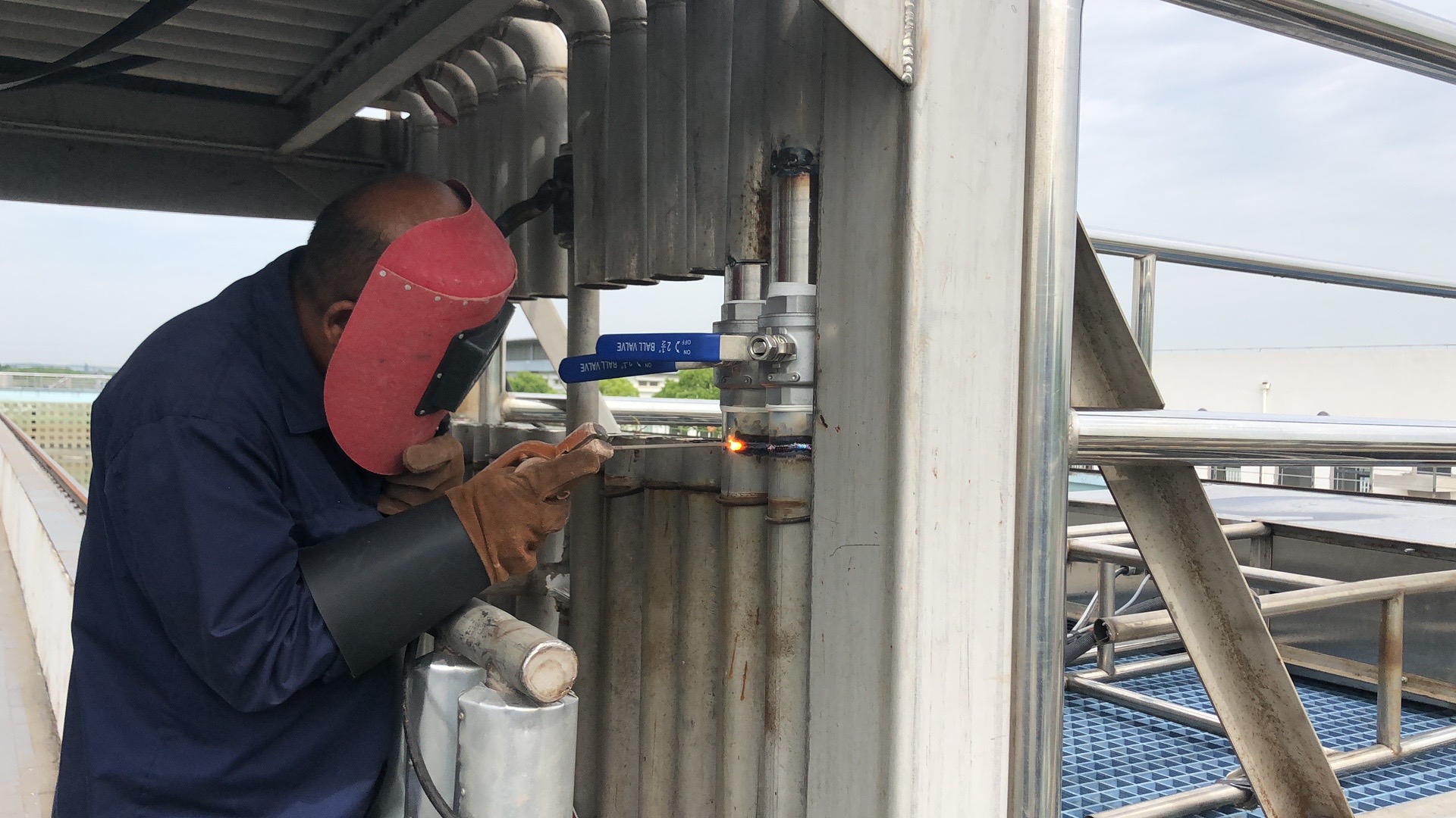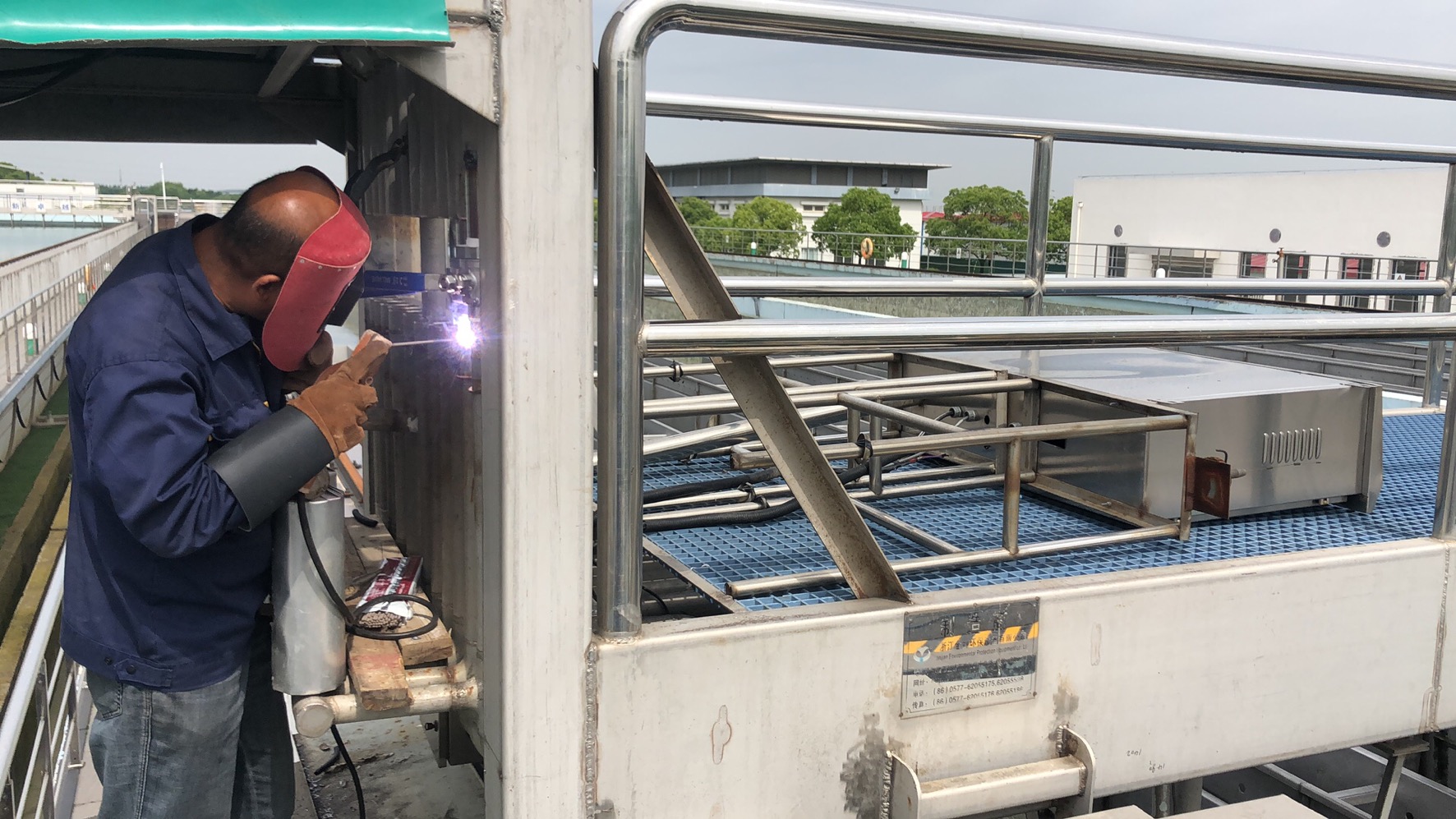 相城水廠沉淀池的排泥行車閥門原為銅制材料,使用至今已近14年,可能出現老化現象,對沉淀池正常排泥有潛在的影響。為此,水廠將虹吸排泥管上52個、反沖洗管上24個銅制閥門全部更換為不銹鋼閥門。從移除配電柜、切割排泥管、切口整修,到新閥門的組裝和焊接,水廠嚴把每道工序的實施步驟,在保障安全生產的前提下有條不紊地完成了更換,并在進水調試合格后投入使用。