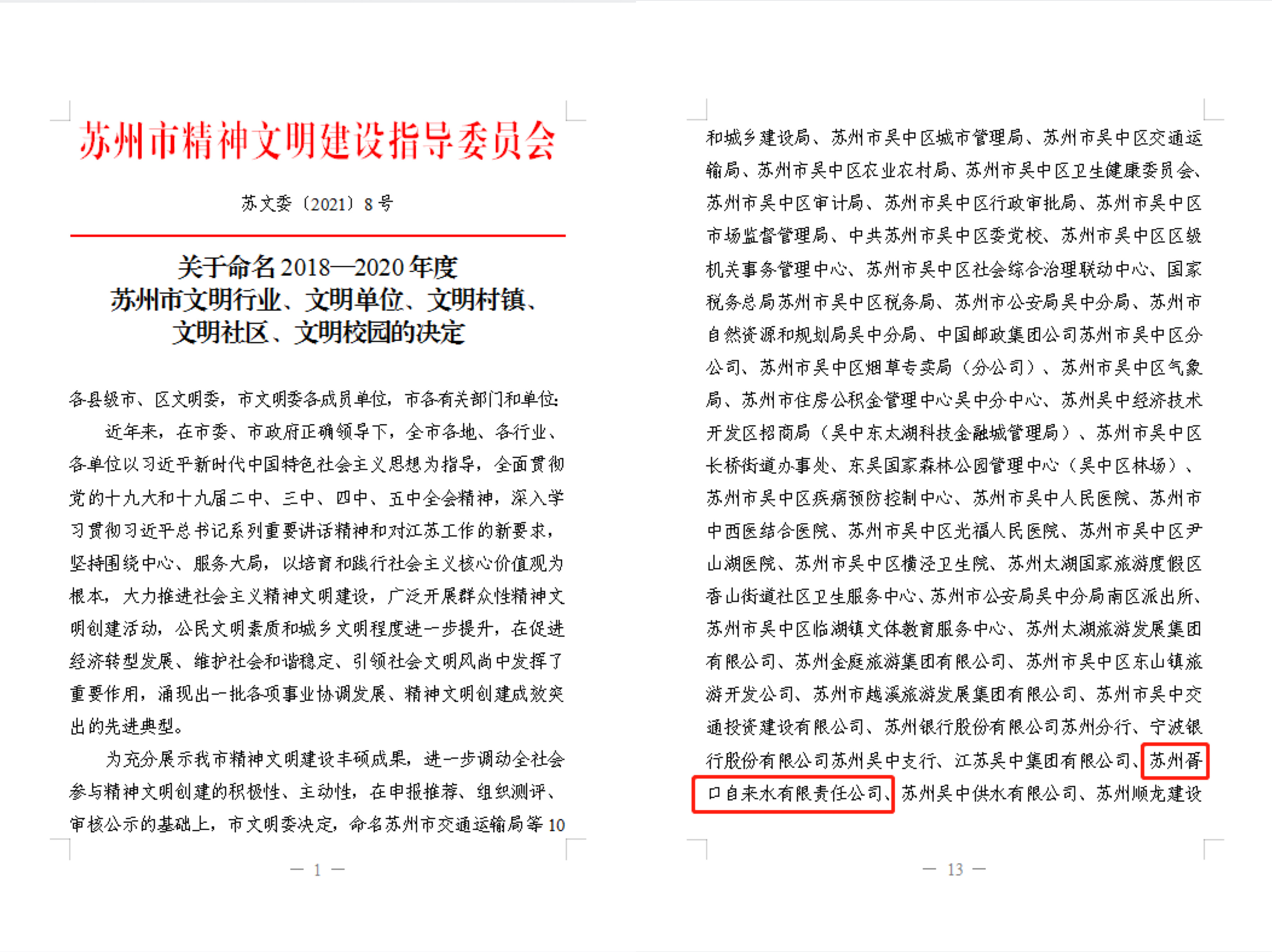 近期,胥口水司榮獲了“2018—2020年度蘇州市文明單位”稱號,這是公司首次獲得該榮譽。