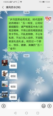 “歲月因勞動而充實,時代因勞動而精彩!五一將至,公司紀委溫馨提醒:請嚴格落實中央八項規(guī)定精神,不用公款吃喝旅游送賀卡節(jié)禮,不亂發(fā)錢物,不公車私用,不出入私人會所,不違規(guī)收送禮品禮金。祝您過一個舒心、快樂、健康、清廉的‘五一’佳節(jié)!”這是五一前夕,公司紀委向全體監(jiān)察對象發(fā)送的節(jié)日廉政短信。